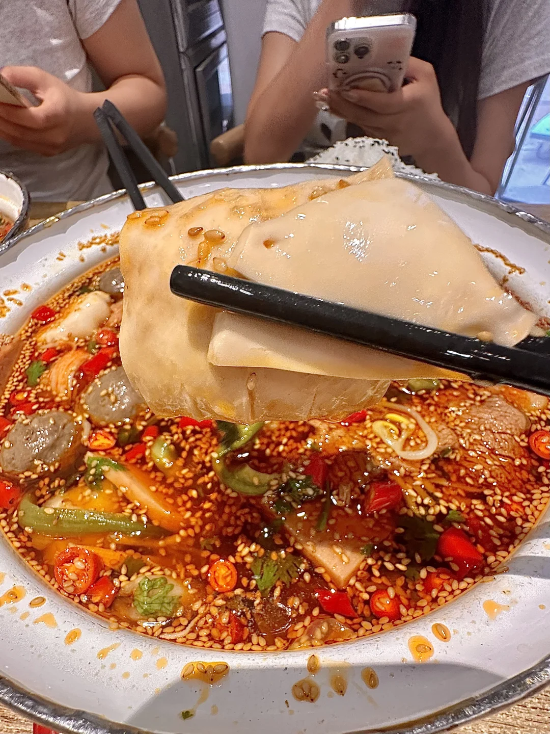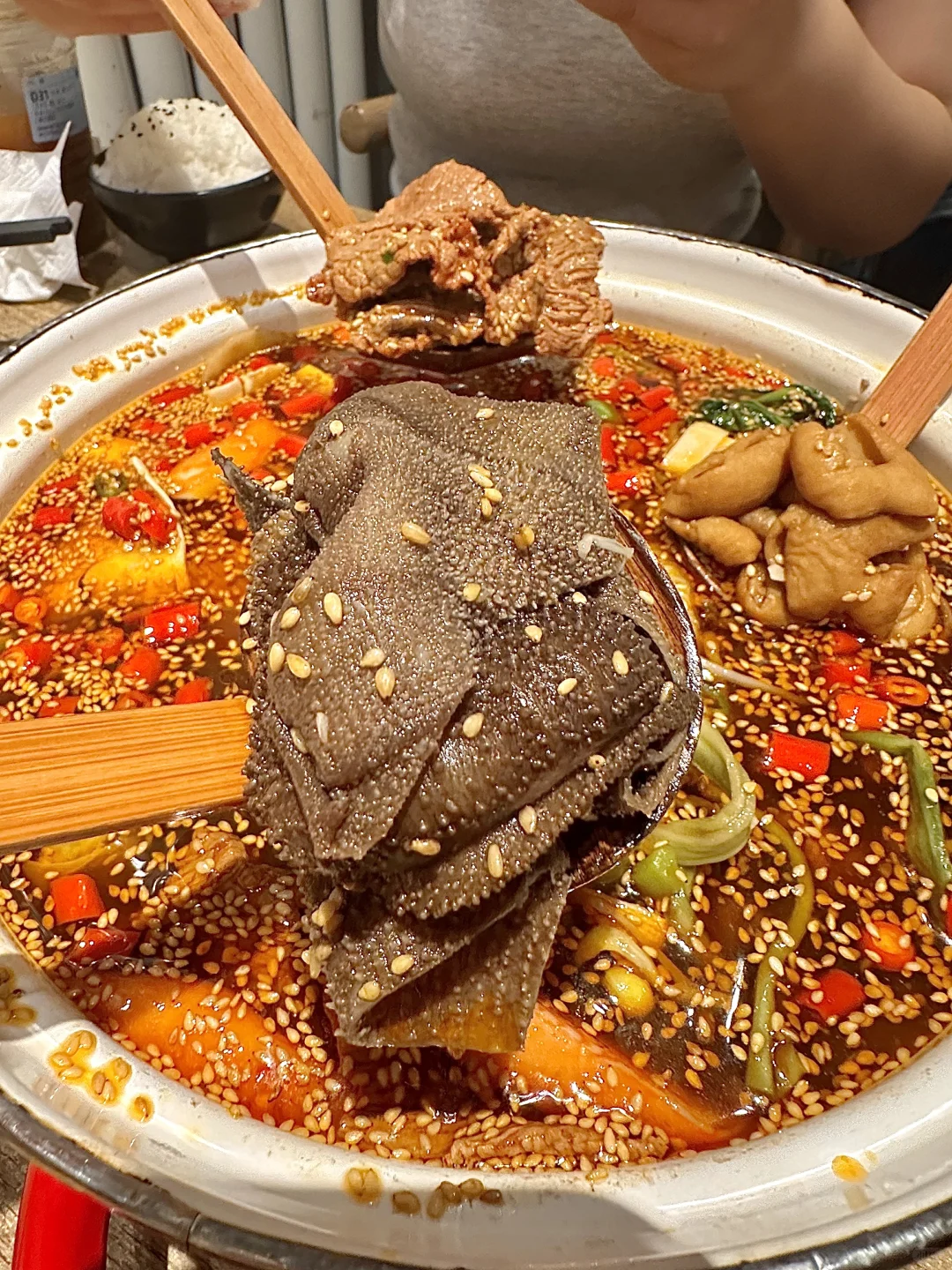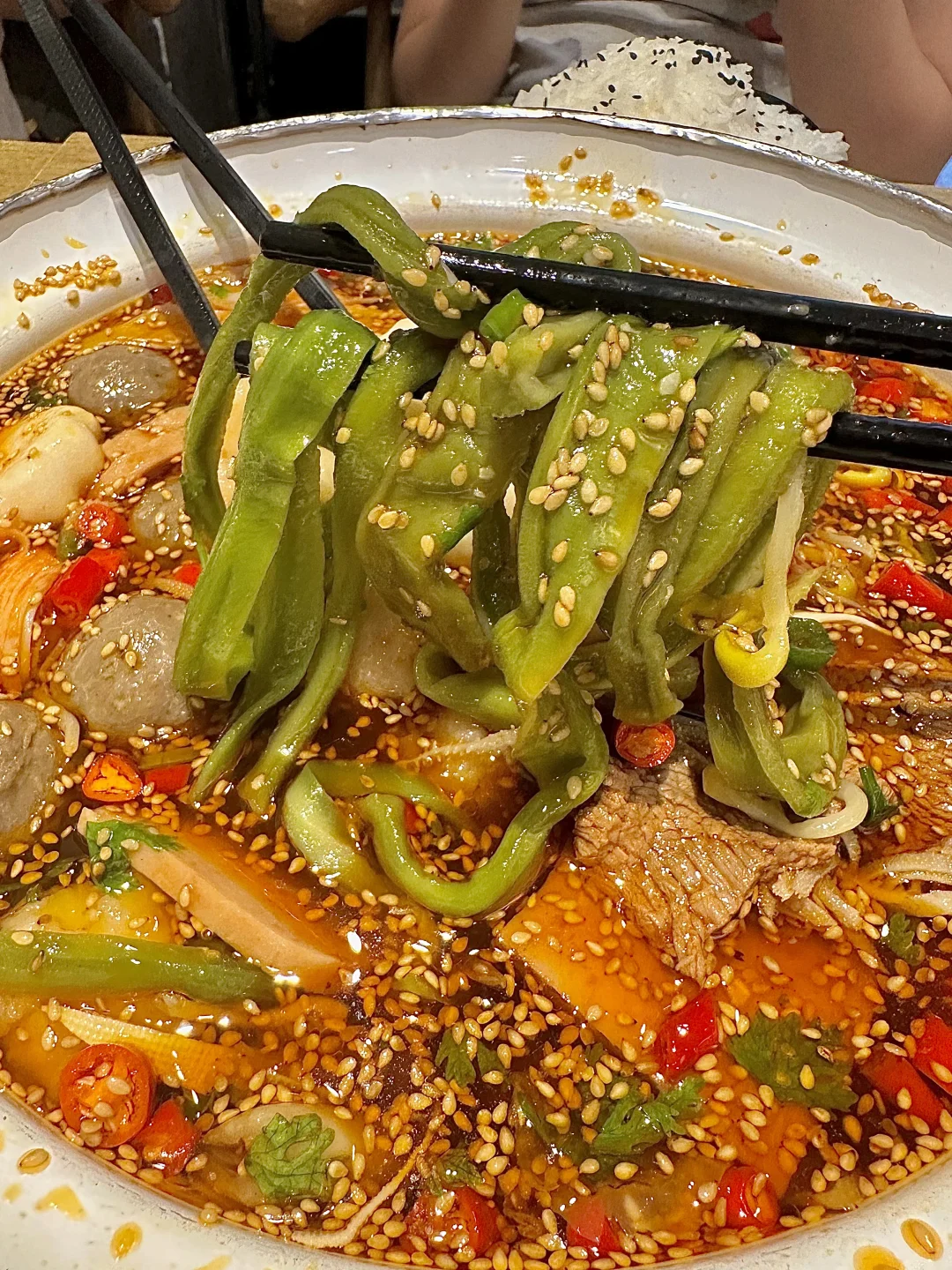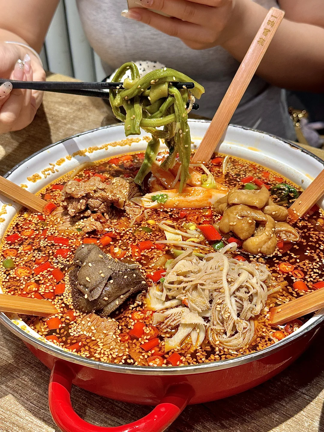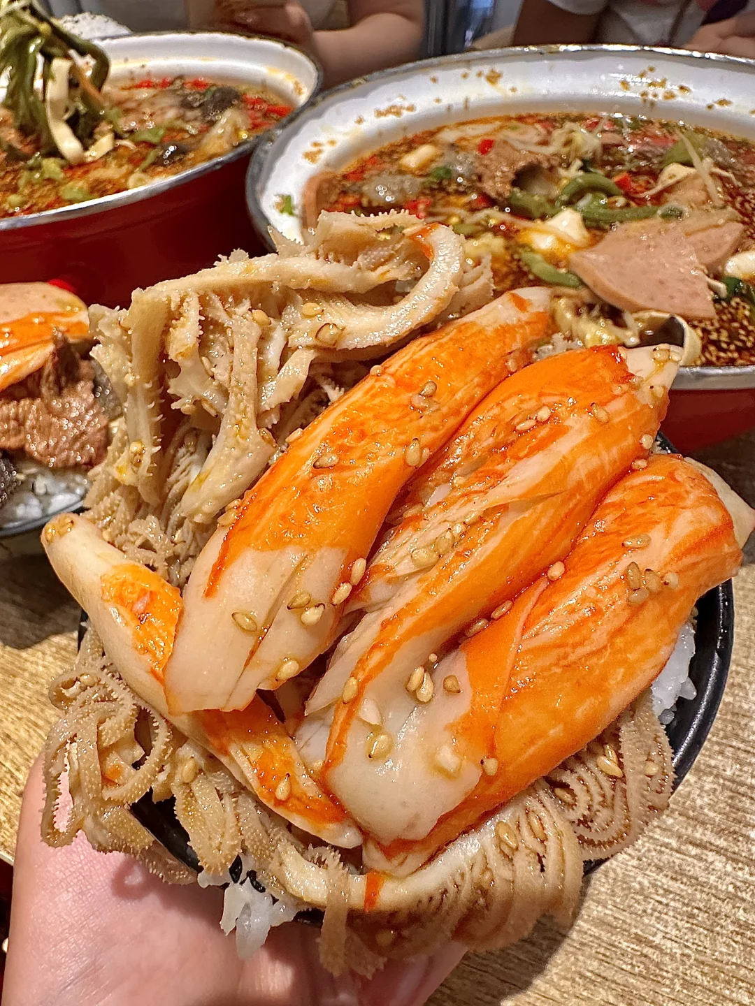 真的是吃过还想吃的一家店! 就为了这碗冒菜,我愿意特意跑一次城阳!! 我们今天下着雨去吃,人都满满的… 锅底真的香s了🥹 是可以直接喝的红油汤!! 蟹柳和毛肚吸足了汤汁,咬一口满满的汁水!! 贡菜和蟹柳搭配绝了!鲜香爽脆!! 他家口味贼正!! 属于偏麻偏辣的,爱吃不改良口味的姐妹冲🙋