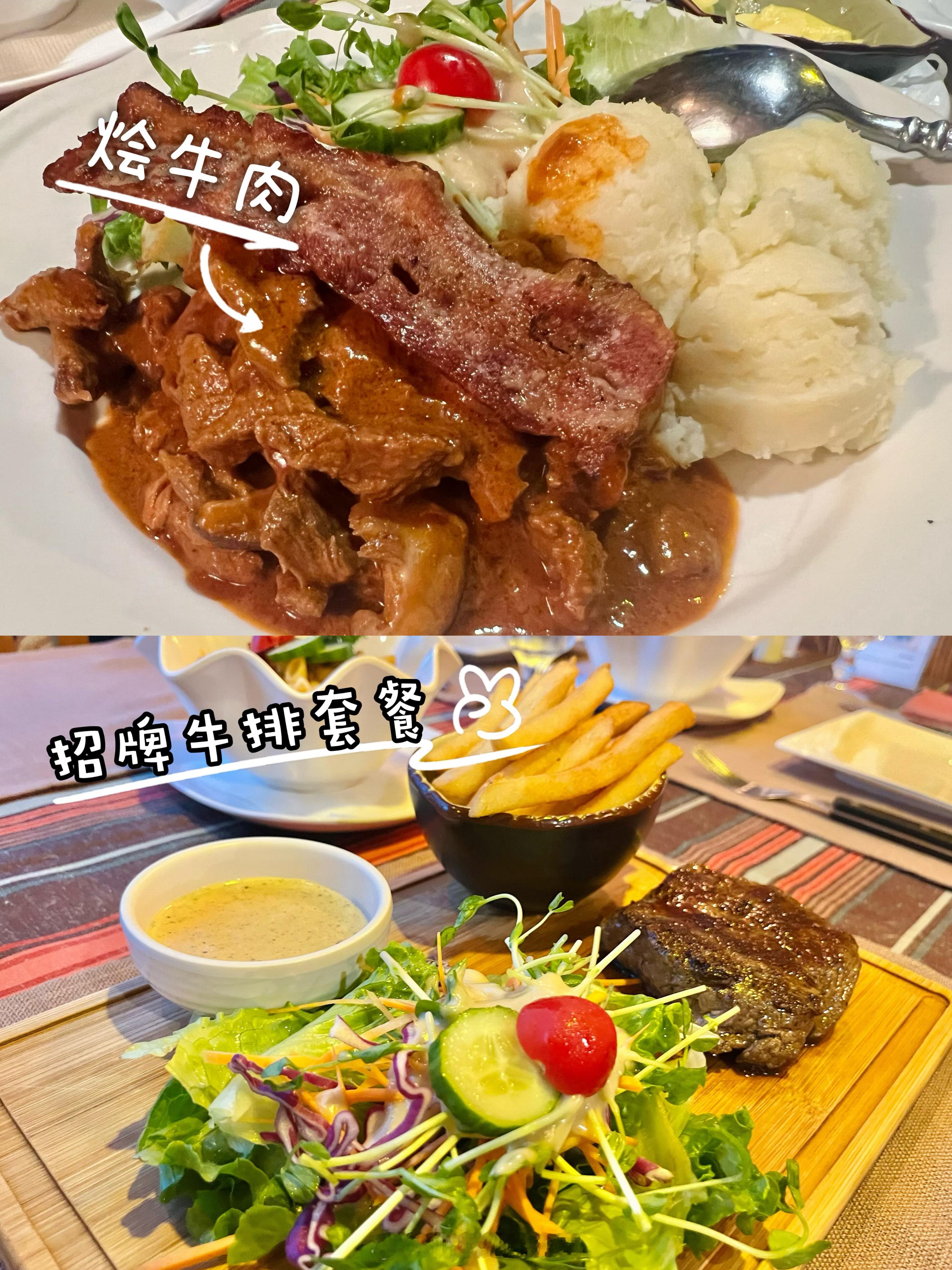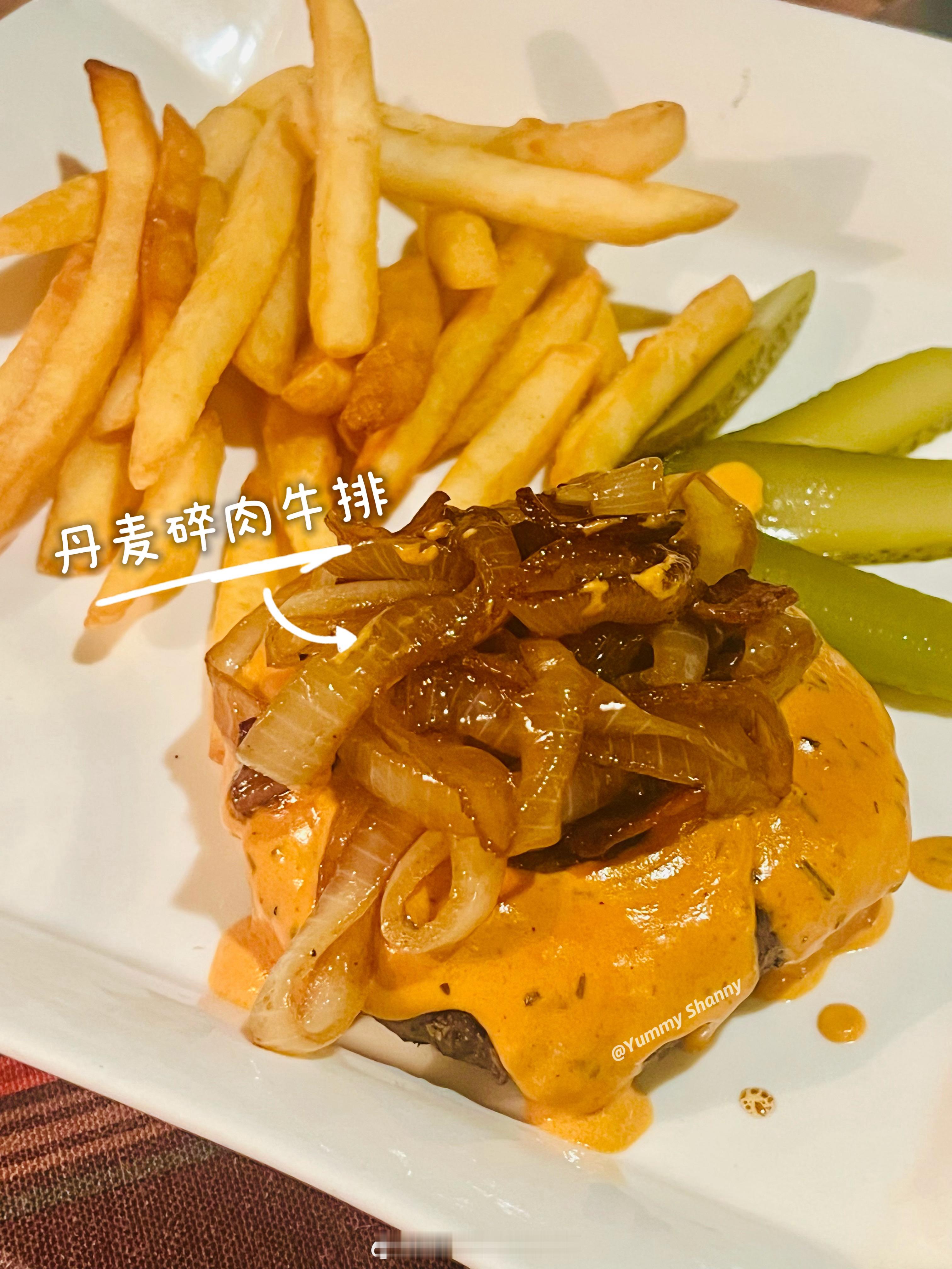 🥪【丹麦开放三明治】一定要尝尝,五种配菜搭配黑面包和黄油,可以想吃哪道配哪道;🥩【丹麦牛排】是Jan每次来的必点,和传统牛排有区别,这款是碎肉牛排,搭配洋葱和餐厅特调威士忌酱,让牛排吃起来更多汁。他家最出名的其实是传统牛排🥩,性价比很高,100多的牛排套餐可以闭眼点,薯条炸的也厚实饱满又酥脆~ 另外,一定要尝尝多种口味的丹麦传统佐餐酒,老板Celine总会在最合适的时间出现,给你倒上最搭配你菜品的那一款。