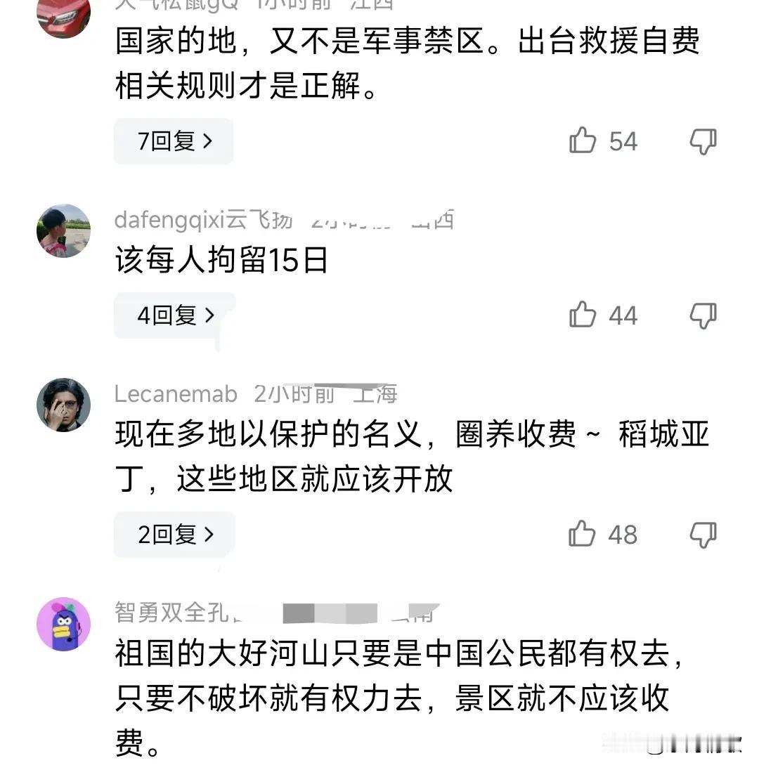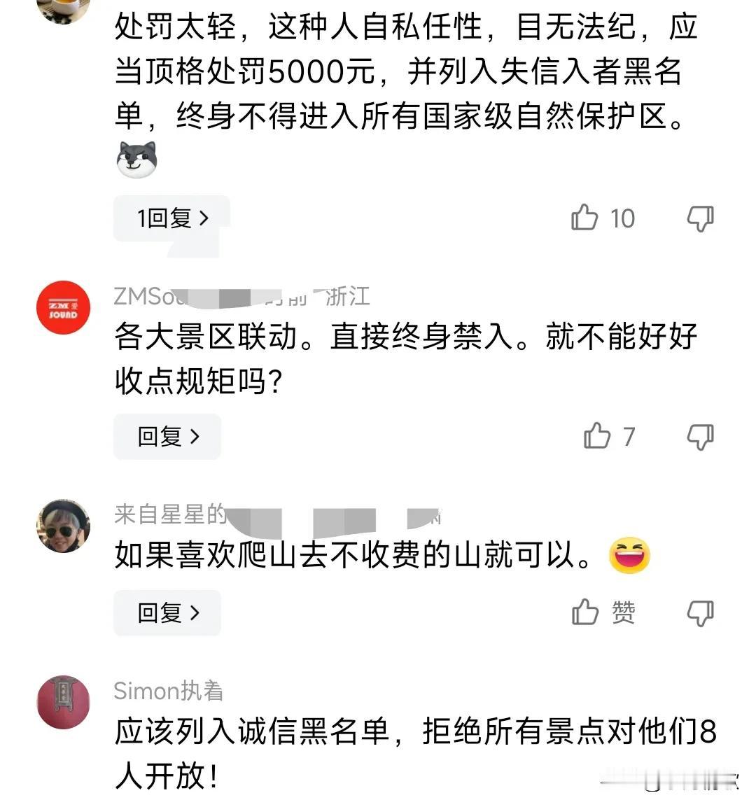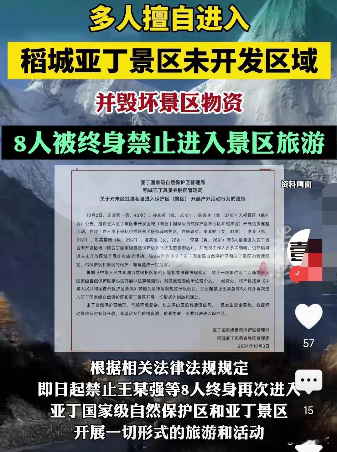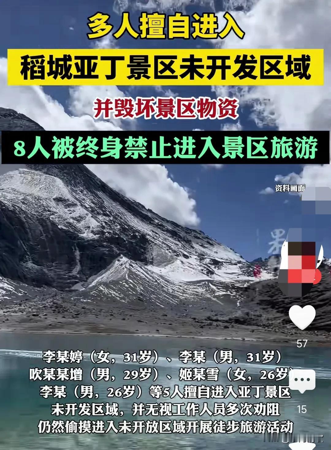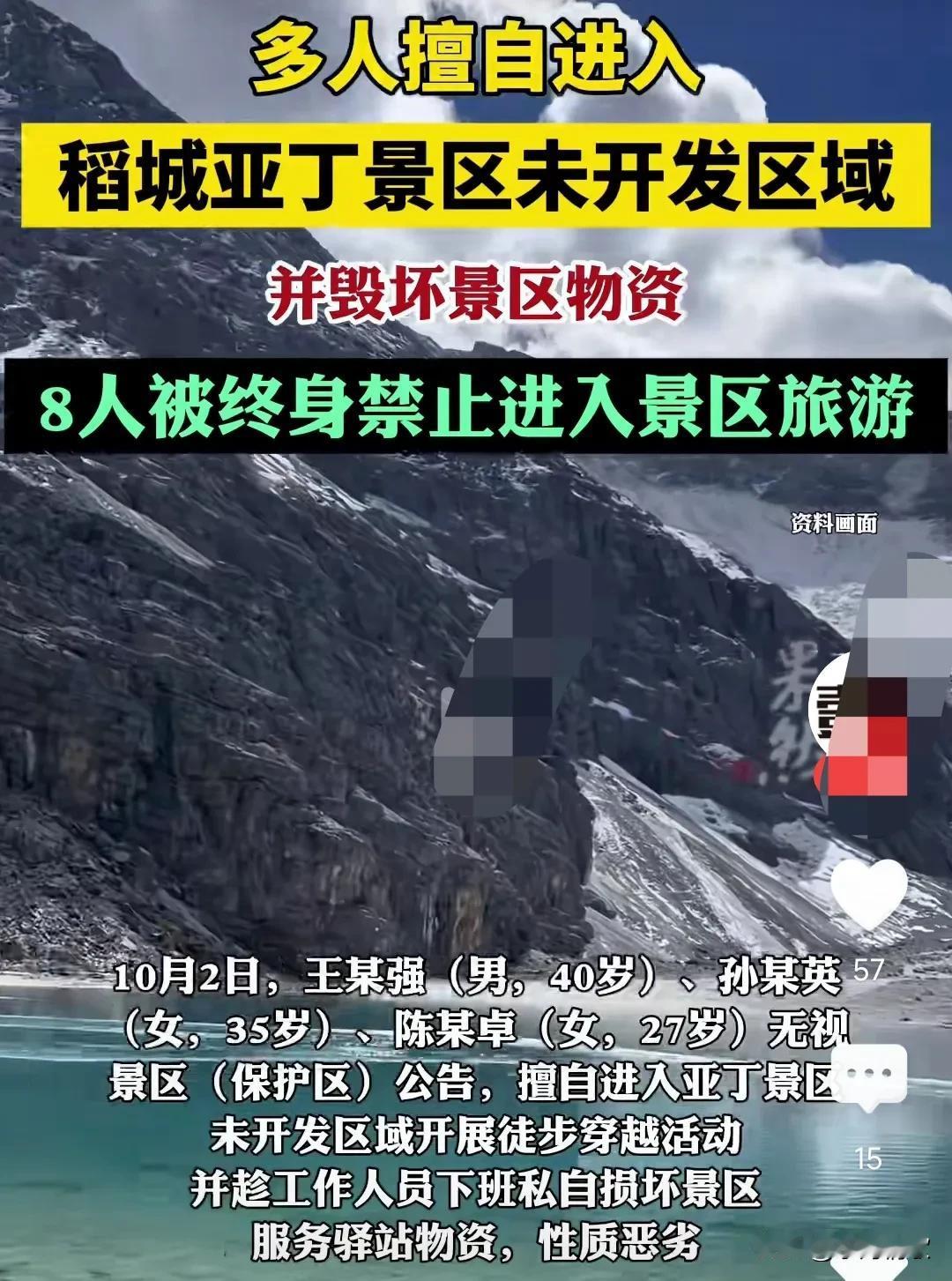 驴友们就想到处的进入一些未开发的景点,想去观赏美好大自然,但是有时候会遇到一些危险,就会造成人员去营救,建议对这些驴友进行罚款,将这些钱用来捐给慈善机构。 8人被终身禁入四川稻城亚丁景区,别的不说,这些人毁坏景区物资这个行为觉得挺坏的,这真的很没品。 景区对这8人进行终身禁入该景区。 我只关心这几个人破坏景区物资,赔偿了没有? 有些网友的评论也是值得深思的。 #8人被终身禁入四川稻城亚丁景区#