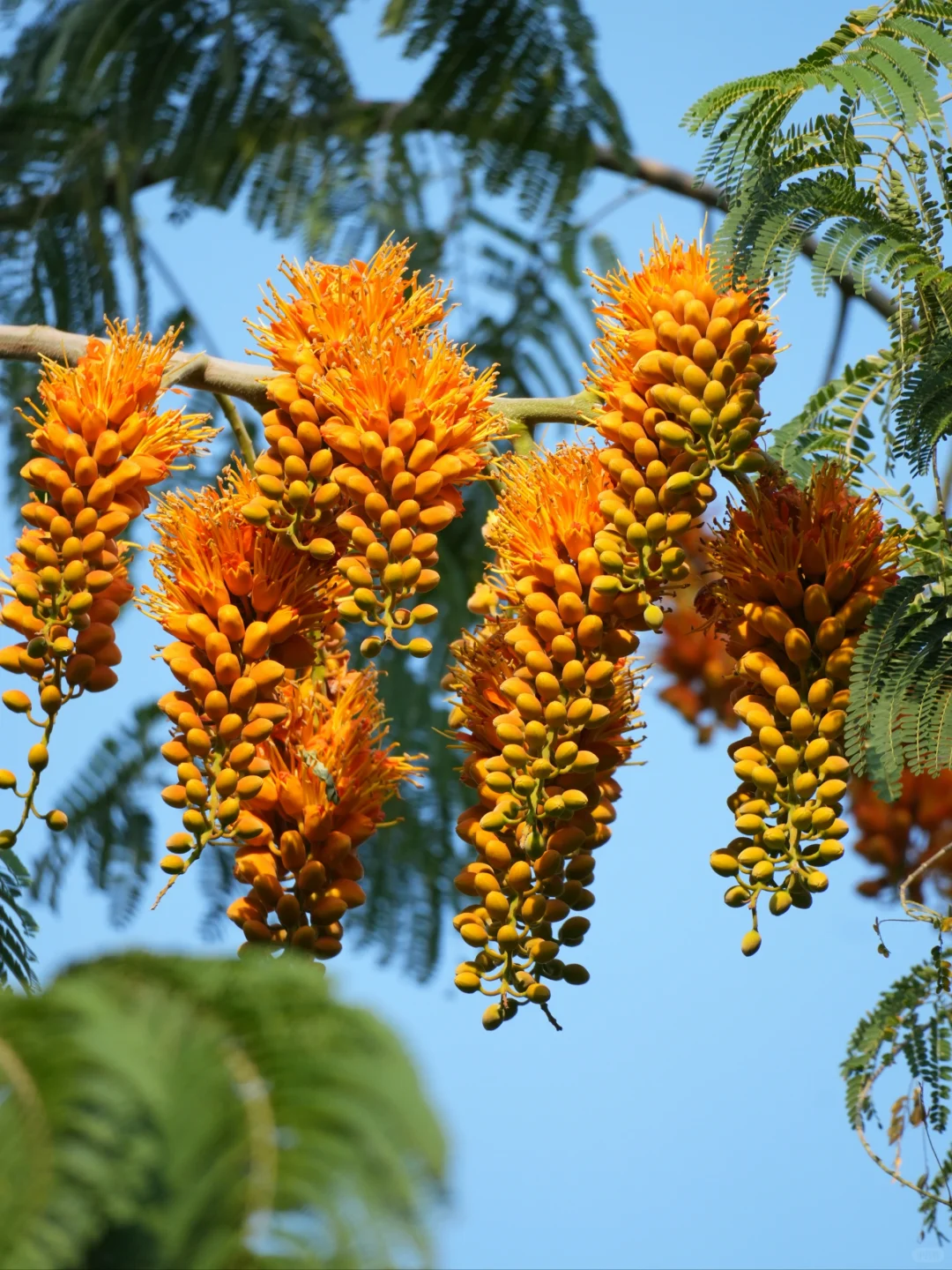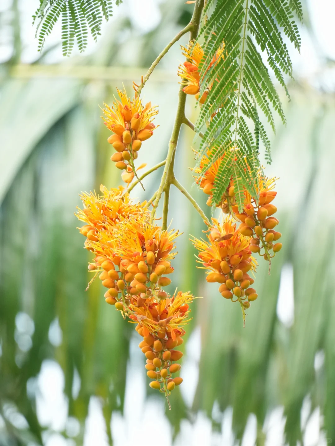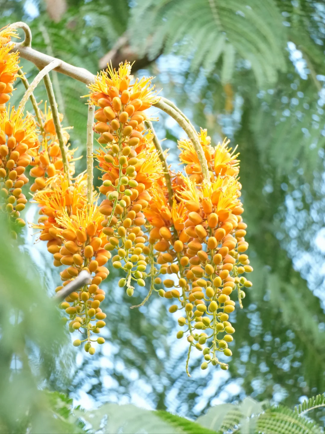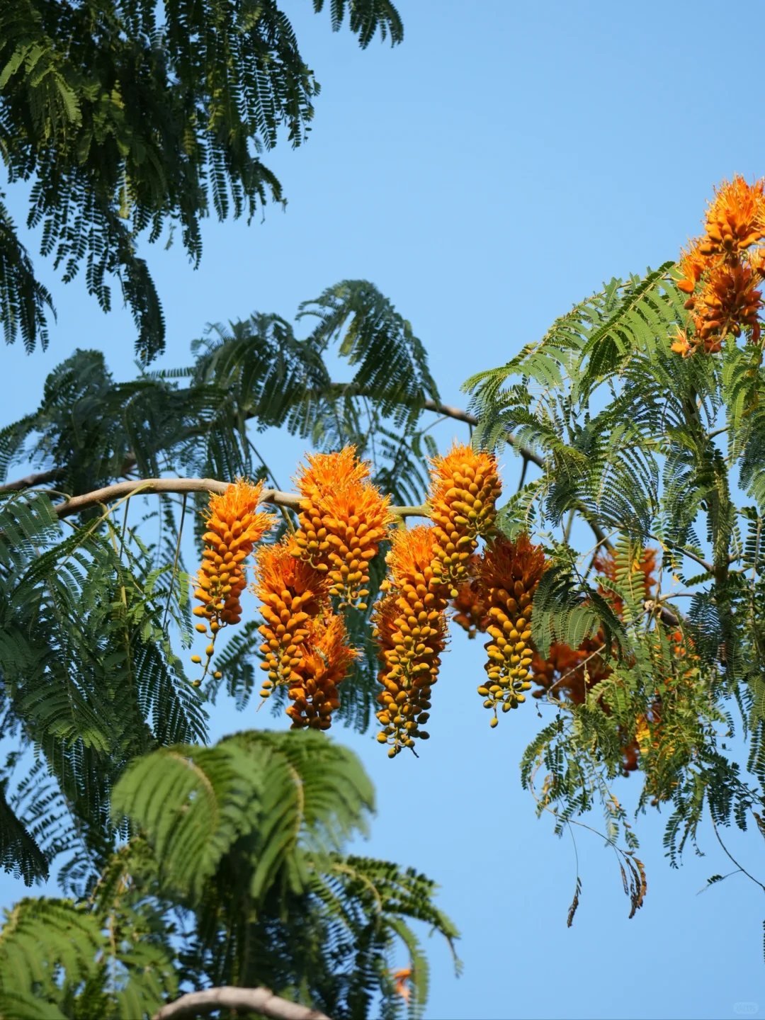 🌼 橙黄色的花朵,一串串垂下,如同金色的雨滴,随风轻轻摇曳。她的名字,垂花楹,正是由此而来。