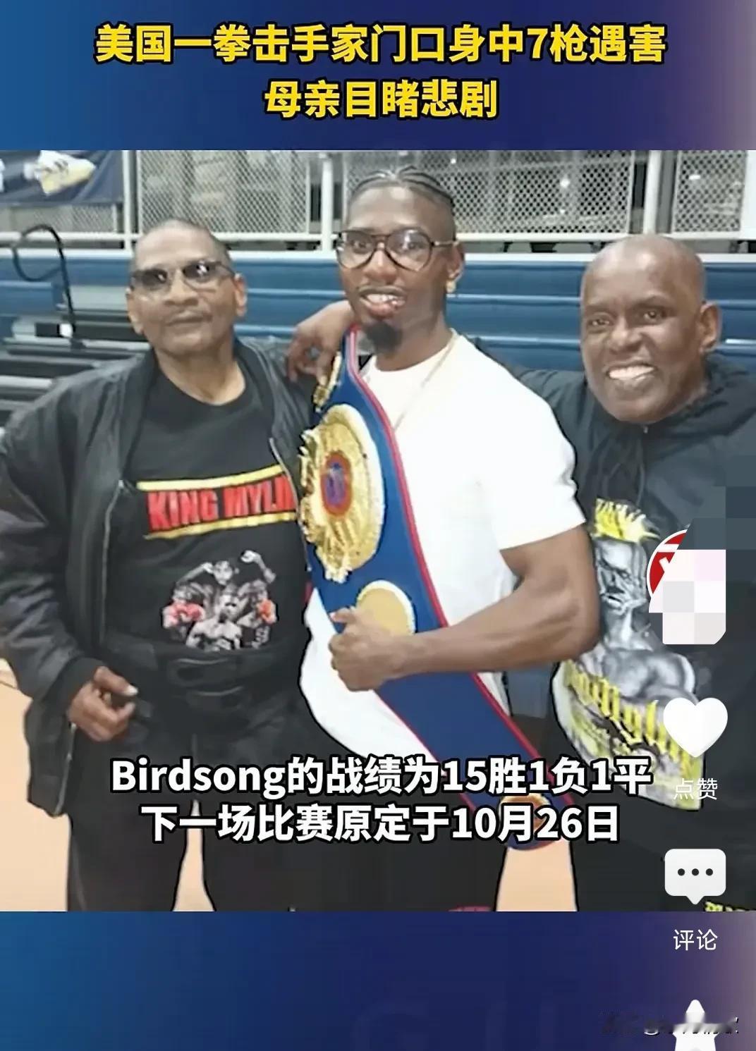 这真的是太疯狂了,美国一名黑人拳击手竟然在家门口遭到两名枪手的射击,中七枪遇害。 这治安真的是太差劲了,这就是美国合法拥有枪支的弊端性。 这位拳王是31岁是世界级拳王,虽然没打多少场比赛,但是胜率太牛了。 男子被别人用枪射击,其母亲也看到了这一幕。 开枪后,枪手驾车离去。 下场比赛,原本于10月26日。 这恶性事件实在是太让人没安全感了,美国这地方真是让人瑟瑟发抖。 #美国一拳击手家门口中七枪遇害#