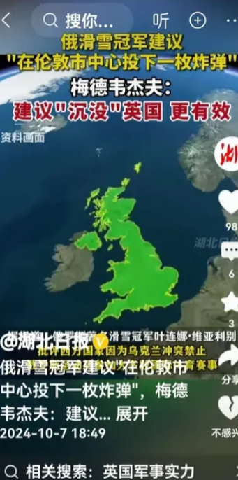 英国政客知道了心惊肉跳,俄罗斯千万别来真的。 网曝:俄罗斯滑雪冠军建议“在伦敦市中心投下一枚炸弹”梅德韦杰夫说。 建议“沉没”更有效。 这可是俄罗斯高层的话,有这个说法,就有这个想法,有这想法時机成熟了就会有这个做法。 英国政客要当心了,别总拿着“暴风影音巡航导弹”给乌克兰,換来的是大英帝国沉海底。