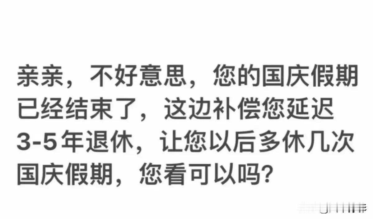 亲亲,不好意思,您的国庆假期已经结束了,这边补偿您延迟3-5年退休,让您多领几年奖金,多休几次国庆假期,您看可以吗?
