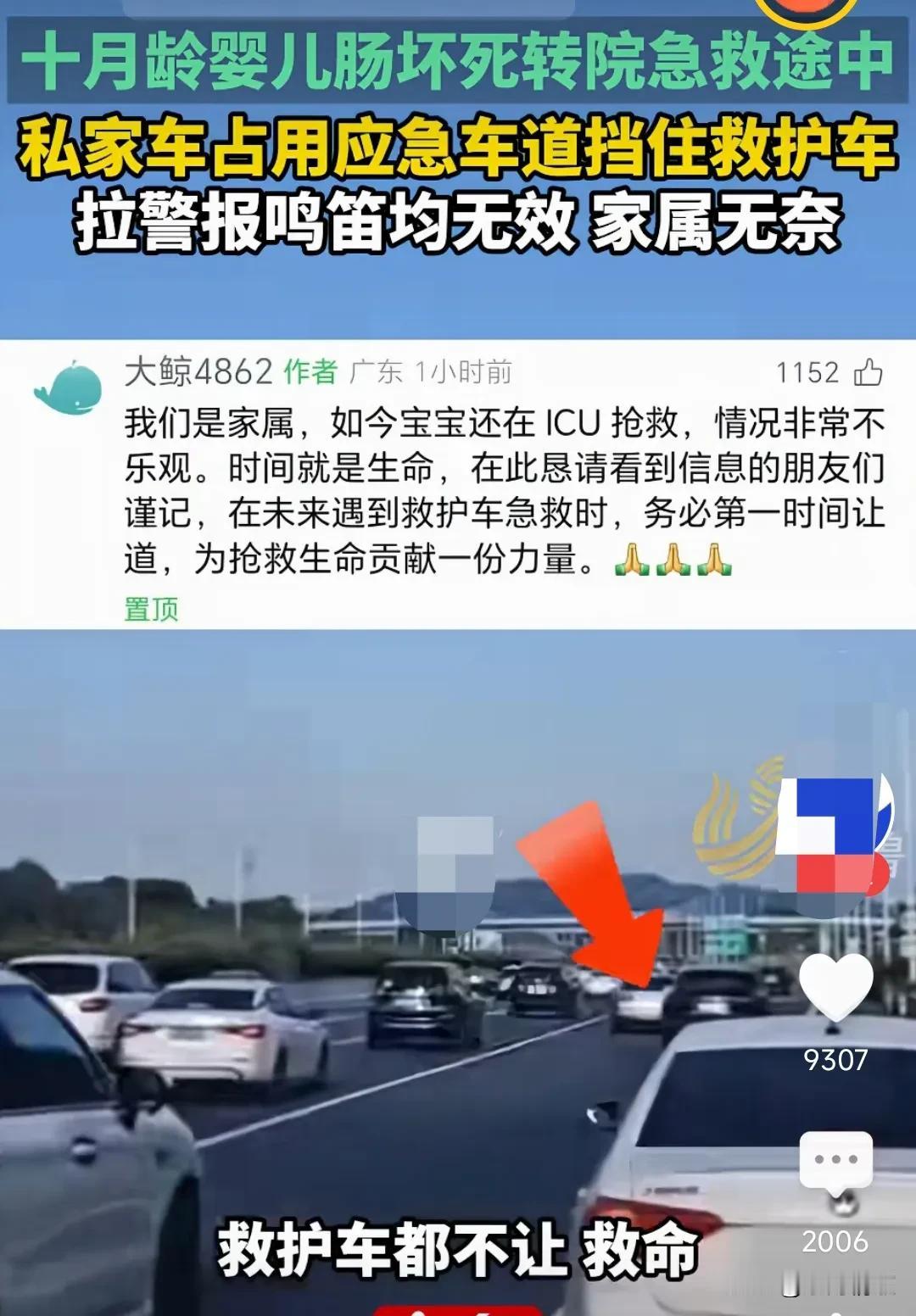 实在是太丧心病狂了,令人发指到了极点,让人愤怒,私家车竟然占用应急车道,在那里自顾自的行驶,挡住救护车的去路,而车上有一名10个月大的婴儿肠坏死,准备转院。 时间就是生命,而这个白色车辆有好几次变道让救护车的机会都没有让,这白色小车的车主太坏了,必须严惩,已经涉嫌违法。无缘无故在应急车道开什么。 如果婴儿延误治疗,一定要追究这名车主的责任。 交警行动起来吧。 #私家车占用应急车道挡住救护车#