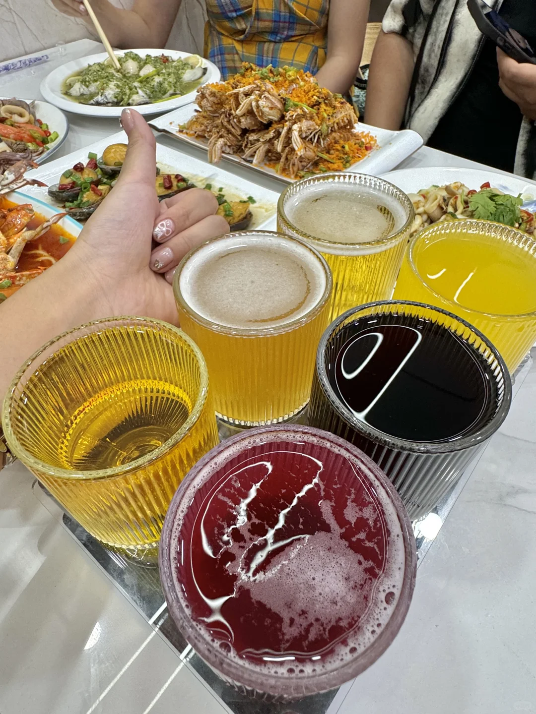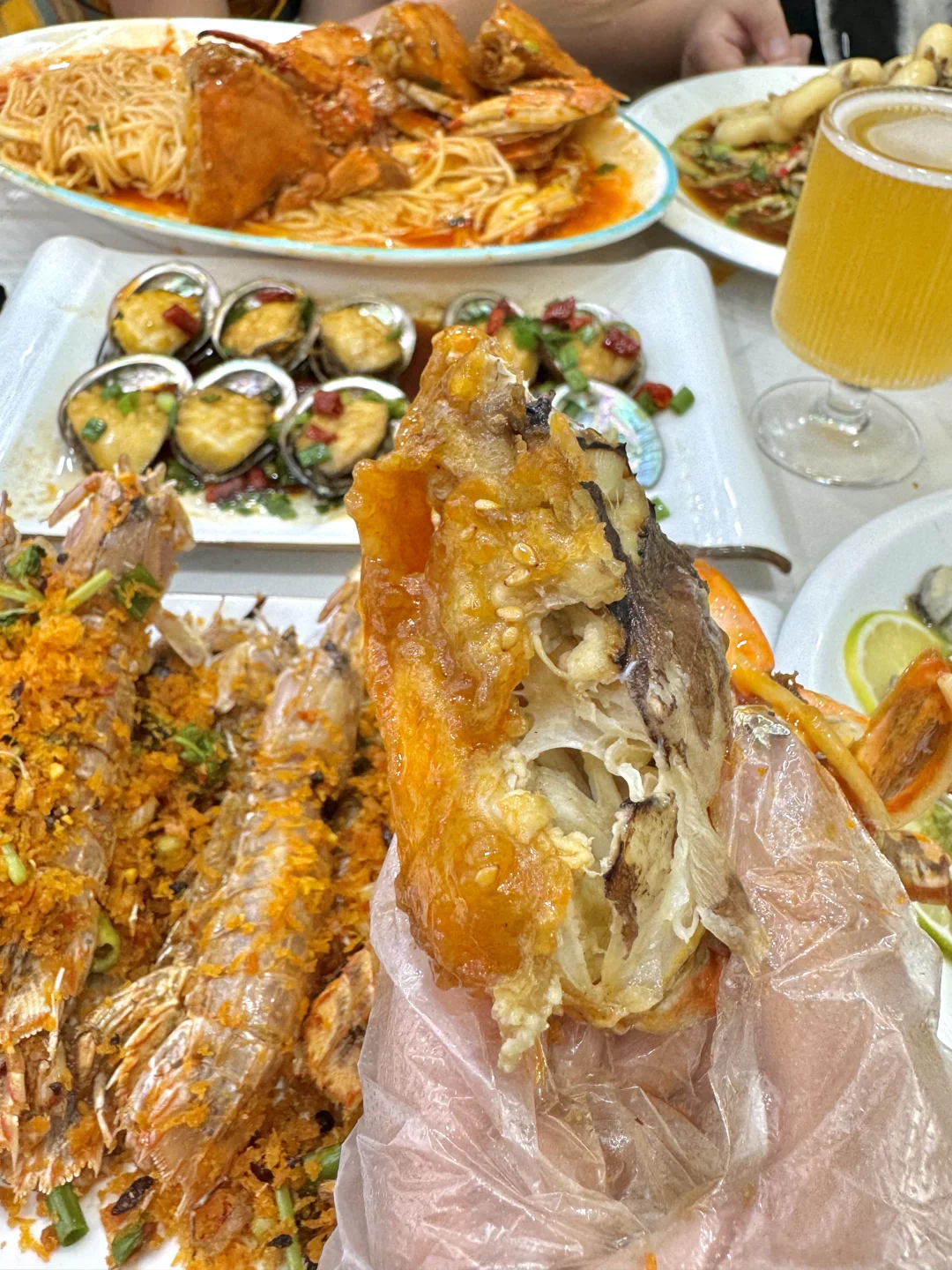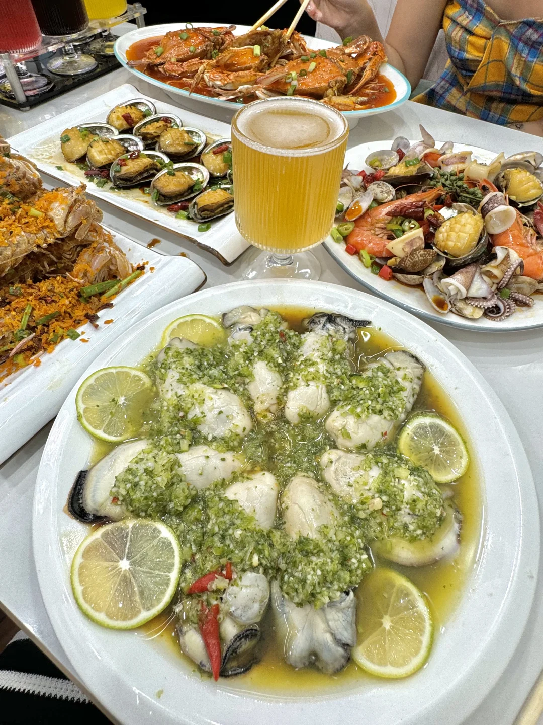 挑了看着就很干净的一家!! 而且店里面还有监控可以看到厨房!!很放心!! Tips:怕被坑的可以提前看看dp!! 超爱他家的芥末双脆!!墨鱼仔和小鱿鱼的火候太好了!!吃起来咯吱咯吱,一吃一个不吱声!! 椒麻四样我提前买的券才33.8r!!大虾、鲍鱼、比管、红岛蛤蜊都有!!鲜香麻辣贼好吃!! 还有香辣蟹拌面和避风塘皮皮虾!!都好好吃! 他家还有啤酒的全家福!!菠萝、百香果、蓝莓、原浆等等6杯!! 而且这个杯子也好好看!!不输精酿店,太chill了~