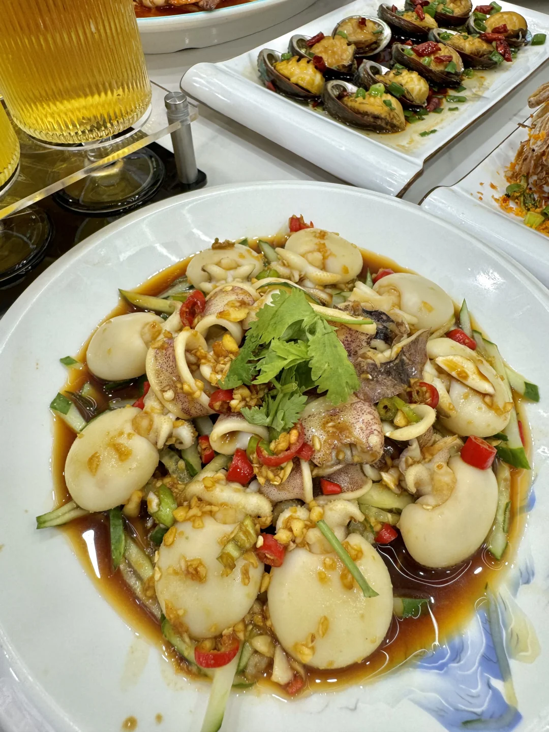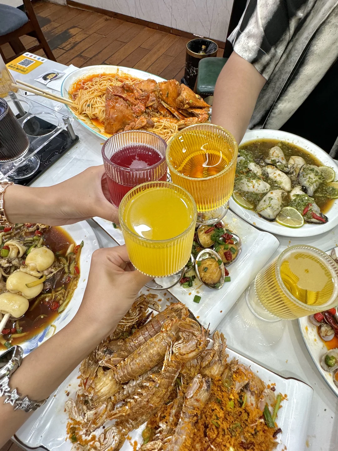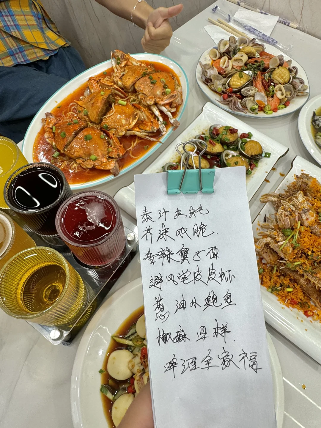 挑了看着就很干净的一家!! 而且店里面还有监控可以看到厨房!!很放心!! Tips:怕被坑的可以提前看看dp!! 超爱他家的芥末双脆!!墨鱼仔和小鱿鱼的火候太好了!!吃起来咯吱咯吱,一吃一个不吱声!! 椒麻四样我提前买的券才33.8r!!大虾、鲍鱼、比管、红岛蛤蜊都有!!鲜香麻辣贼好吃!! 还有香辣蟹拌面和避风塘皮皮虾!!都好好吃! 他家还有啤酒的全家福!!菠萝、百香果、蓝莓、原浆等等6杯!! 而且这个杯子也好好看!!不输精酿店,太chill了~