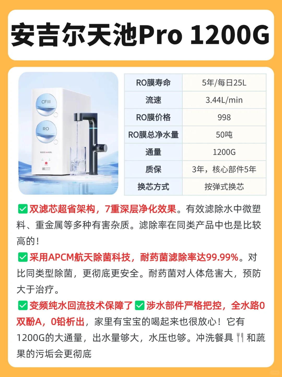 🔍综合上述👉🏻安吉尔天池Pro 1200G净水器,在各个方面表现都很突出👍🏻这款净水器更净、更省、更便捷,性价比很高!