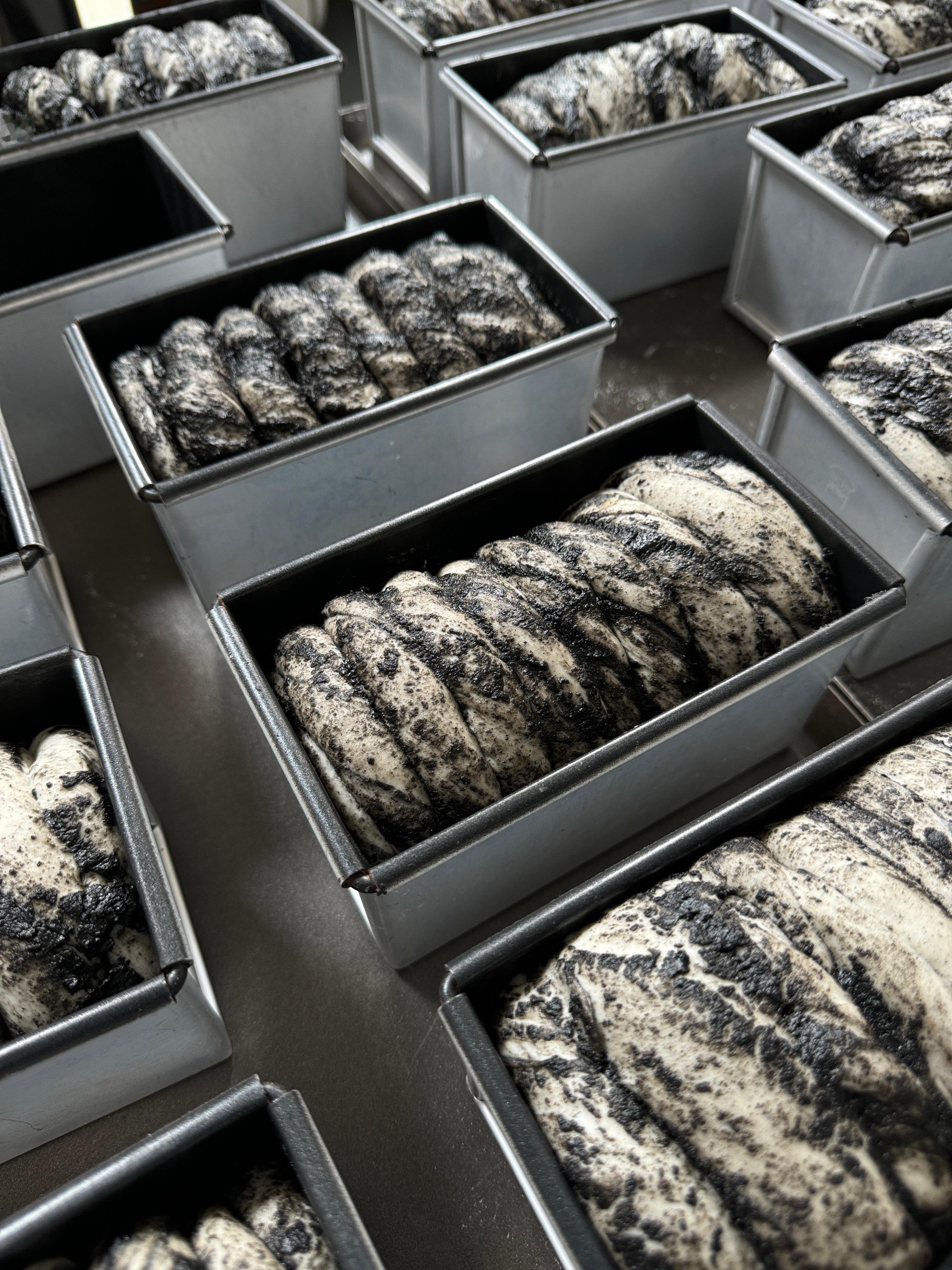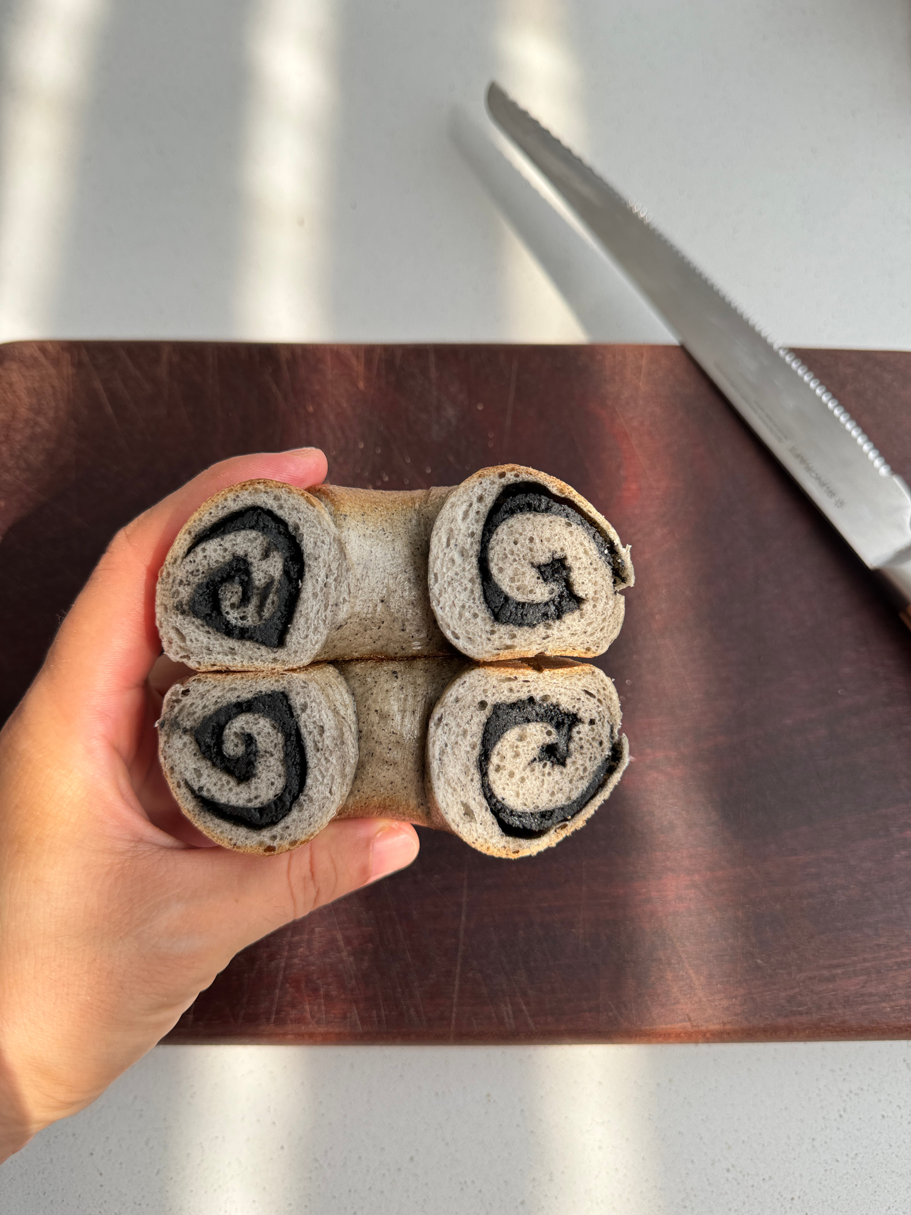 『黑芝麻吐司』: 馅料放得有点多,你们可以当手撕包来吃[笑cry],而且,集合了大家的建议,甜度调得很低,这款吐司用的是椰子油,不加黄油的。