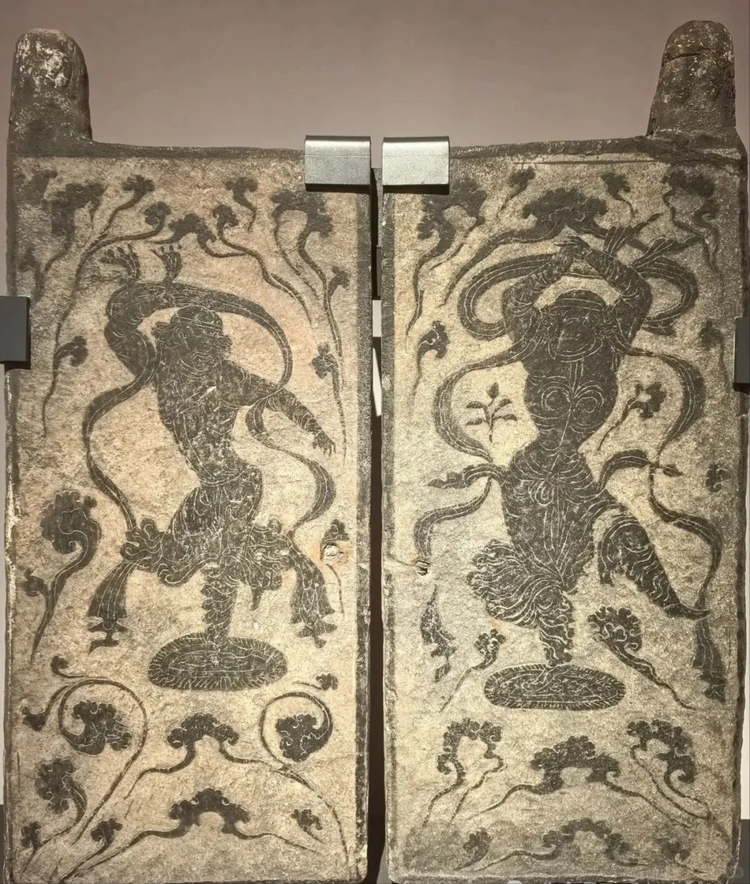 它就是唐胡旋舞石刻墓门,这两个舞者,都是男的。胡旋舞是唐代盛行的舞蹈之一,经西域传入中原,所以称“胡”。又因旋转是其主要特色,故称为“胡旋”。据说这种舞,就是要不停的左右旋转,看起来轻盈,但实际上需要很大的力气和平衡感,所以其实跳这种舞的男的居多。据说安禄山就擅长跳这种舞,也说杨玉环的胡旋舞跳的也好,看来宠妃都有几把刷子!