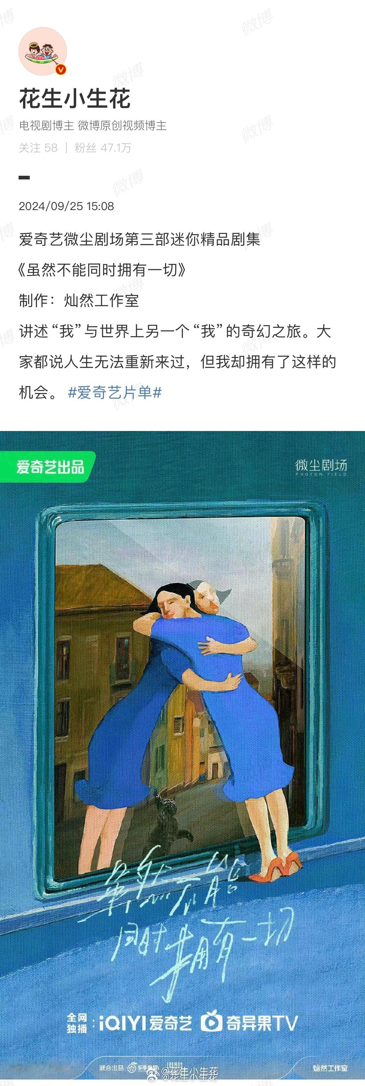 爱奇艺微尘剧场这部《虽然不能同时拥有一切》,改编自作家山本文绪小说《蓝,另一种蓝》。