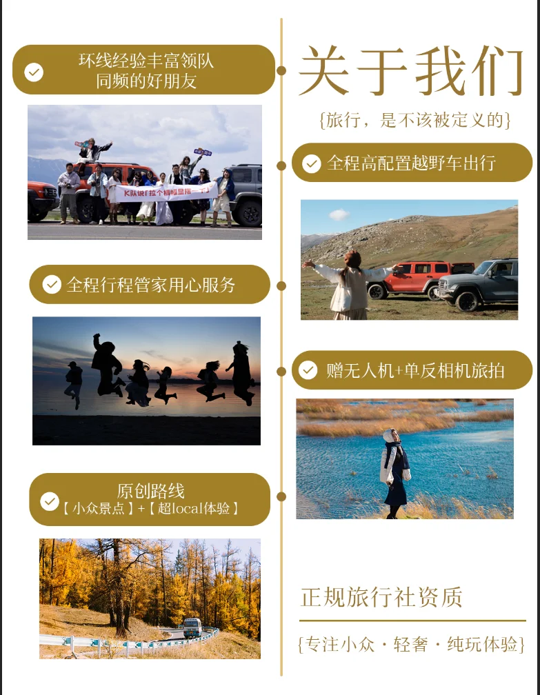 快看看这个【阿勒泰金秋7日游】的行程,既可以一次性打卡阿勒泰经典景点,还可以去小众秘境撒野拒绝人潮涌动,更有极致的秋色盛宴一饱眼福👀