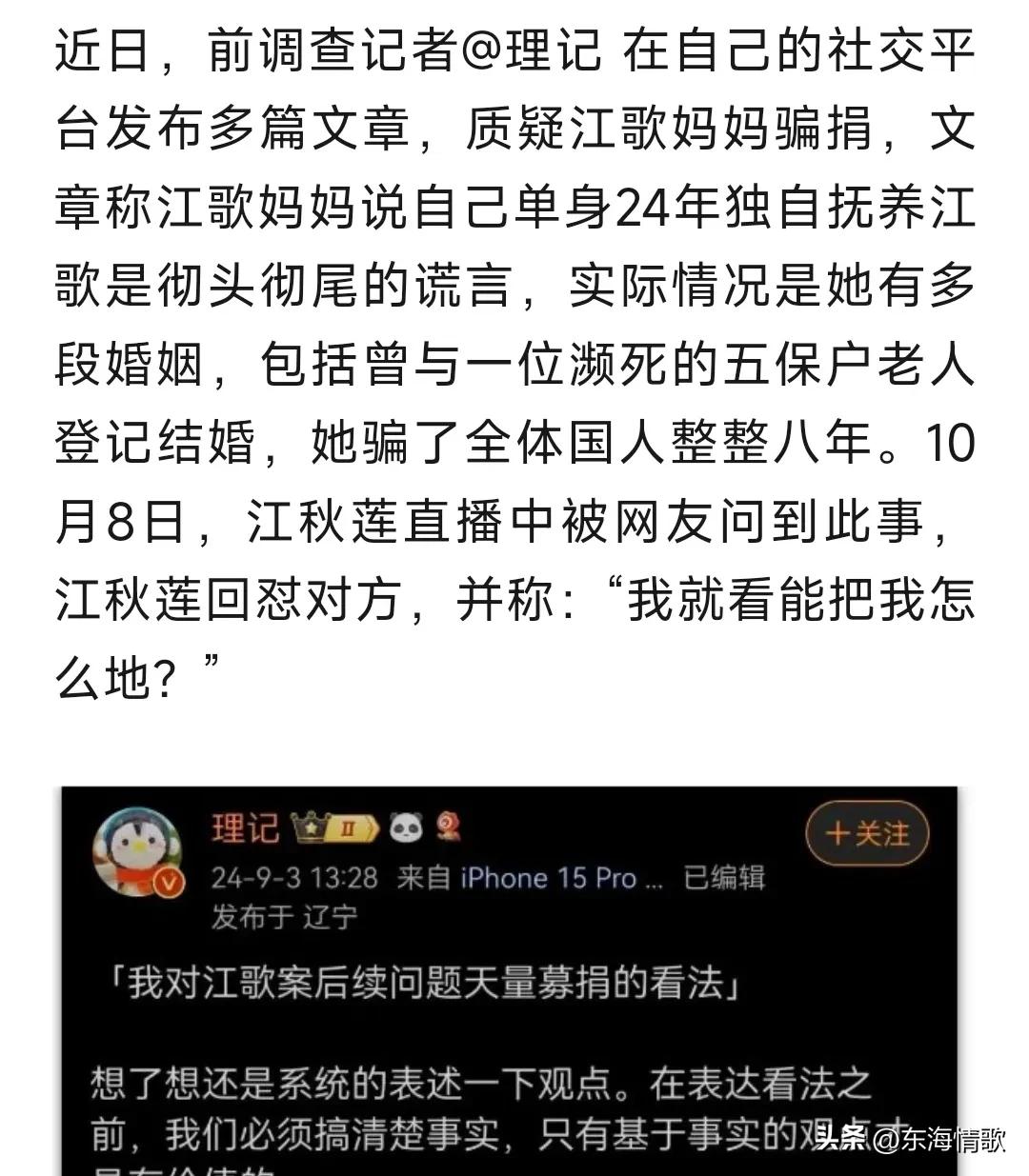 一定要好好查查看,这到底是这个前记者向江秋莲泼脏水,还是确有此事,如果是前记者泼脏水,那么一定要严惩这样的造谣生事者。 如果确实如这个前记者所说,那么也有必要让所有的网友得知此事。 近日前记者曝江歌妈妈失是惊天骗局,并称她还有一个儿子,并且还有多段婚姻,曾与濒死五保护结婚,并不是二十四年独自照顾江歌。 如果前记者爆料为假,那么建议江秋莲女士维权。 如果爆料属实,所有网友也有权知道真相。#前记者爆江歌妈妈失独是惊天骗局#