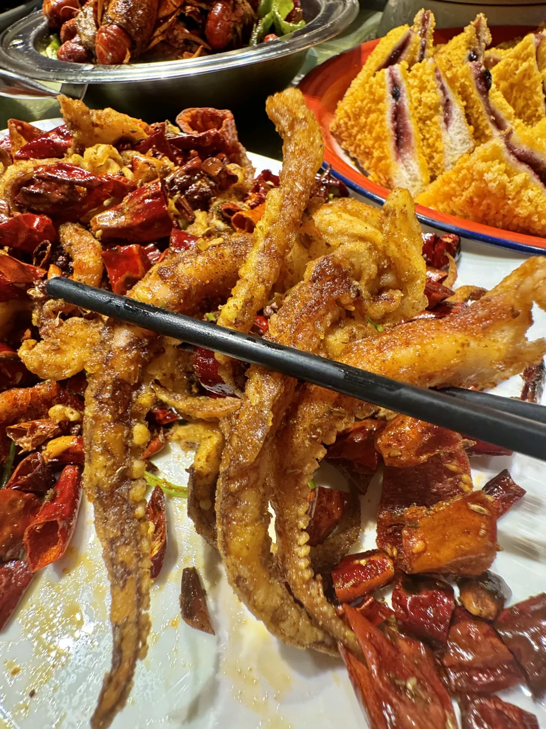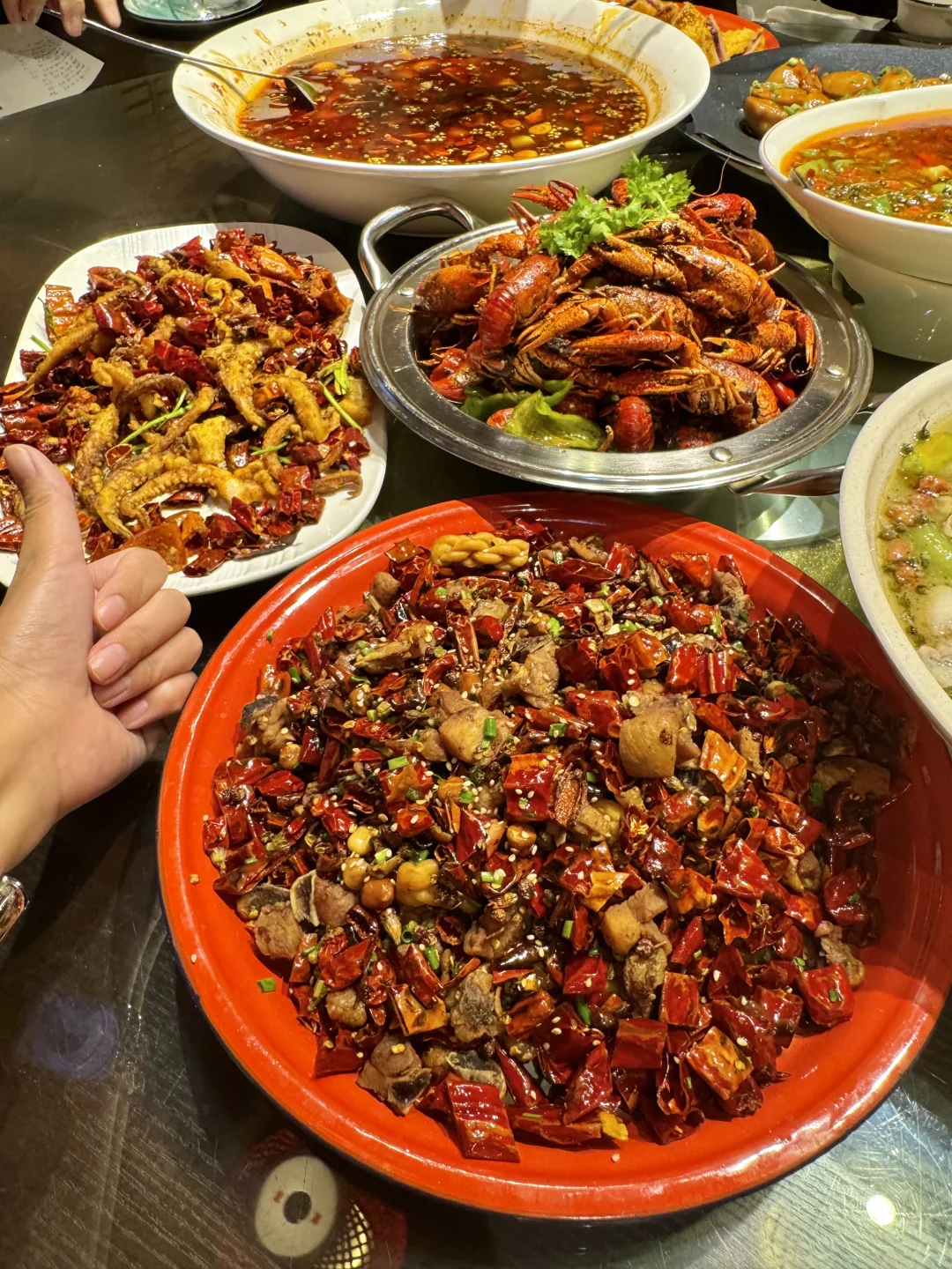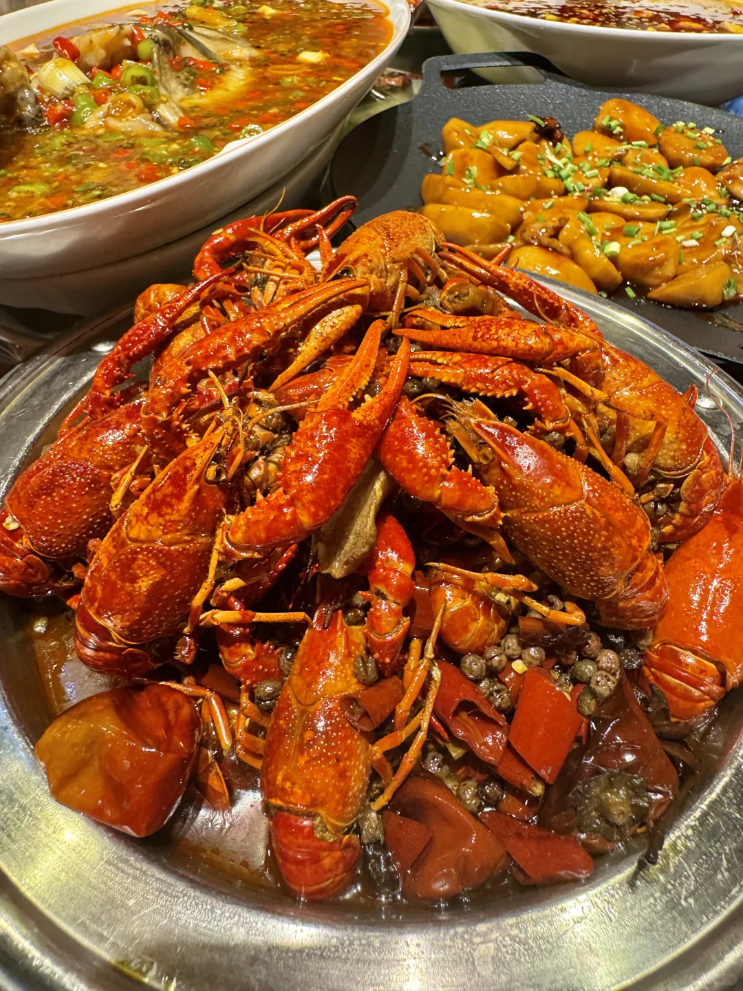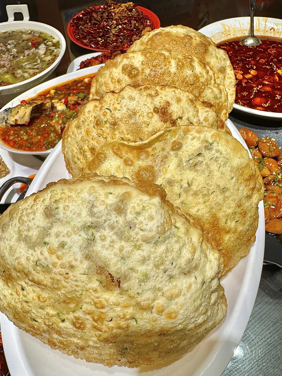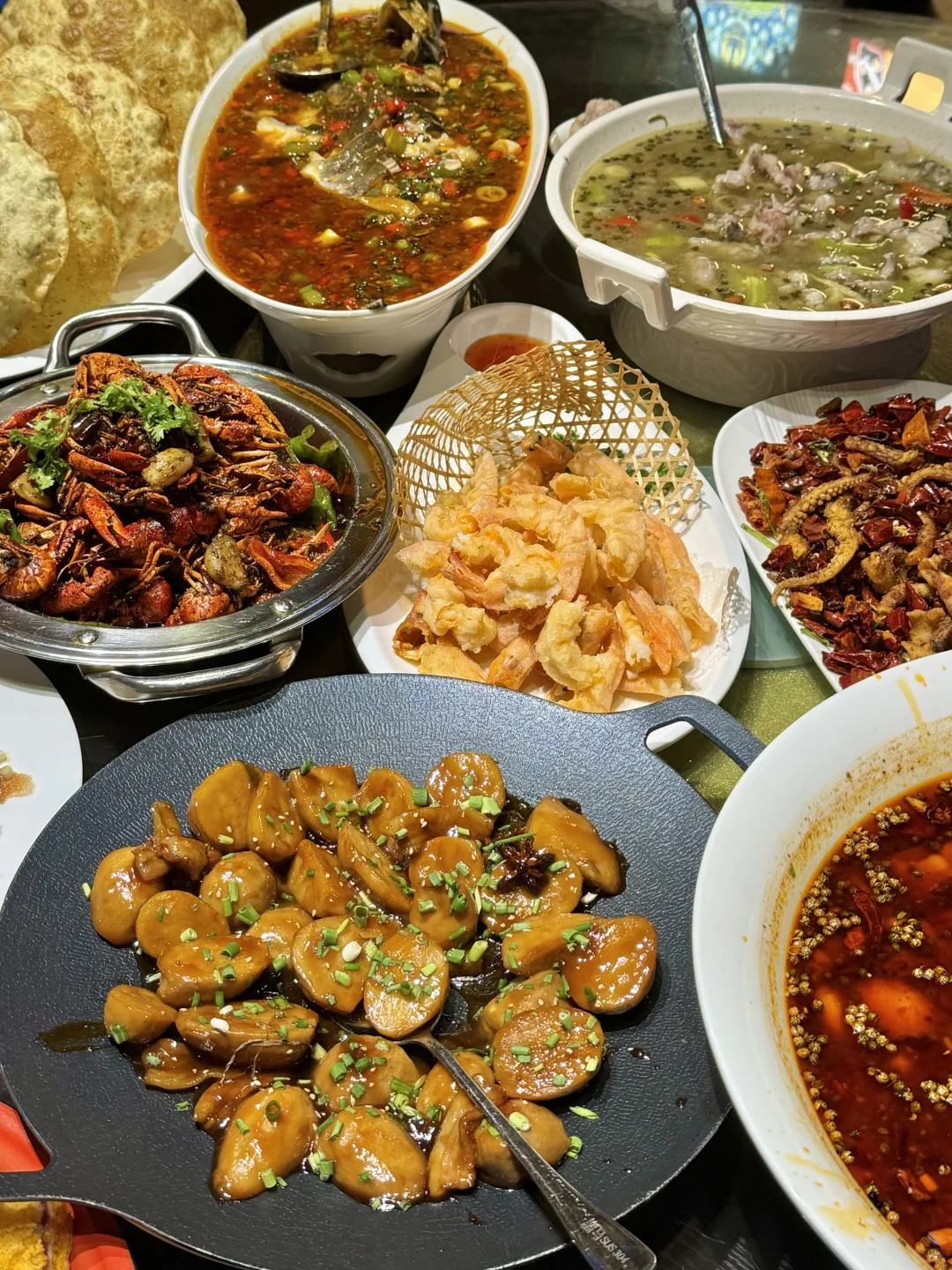 卧卧卧!! 在青岛终于也吃到胖乎乎的气泡葱油饼了!! 之前在上刷到就很想吃😭 真的是一上菜就能闻道的葱油香味!! 圆圆大大的气泡葱油饼看着ju有食欲, 外皮酥脆里面劲道,一定要尝尝!! 还有鲜椒乌江鱼!! 麻辣鲜香!!超下饭! 小龙虾是他家招牌了!吃了得有10年了!! 又新鲜个头又大! 边嗦小龙虾边看奥运!!真的太舒服了!