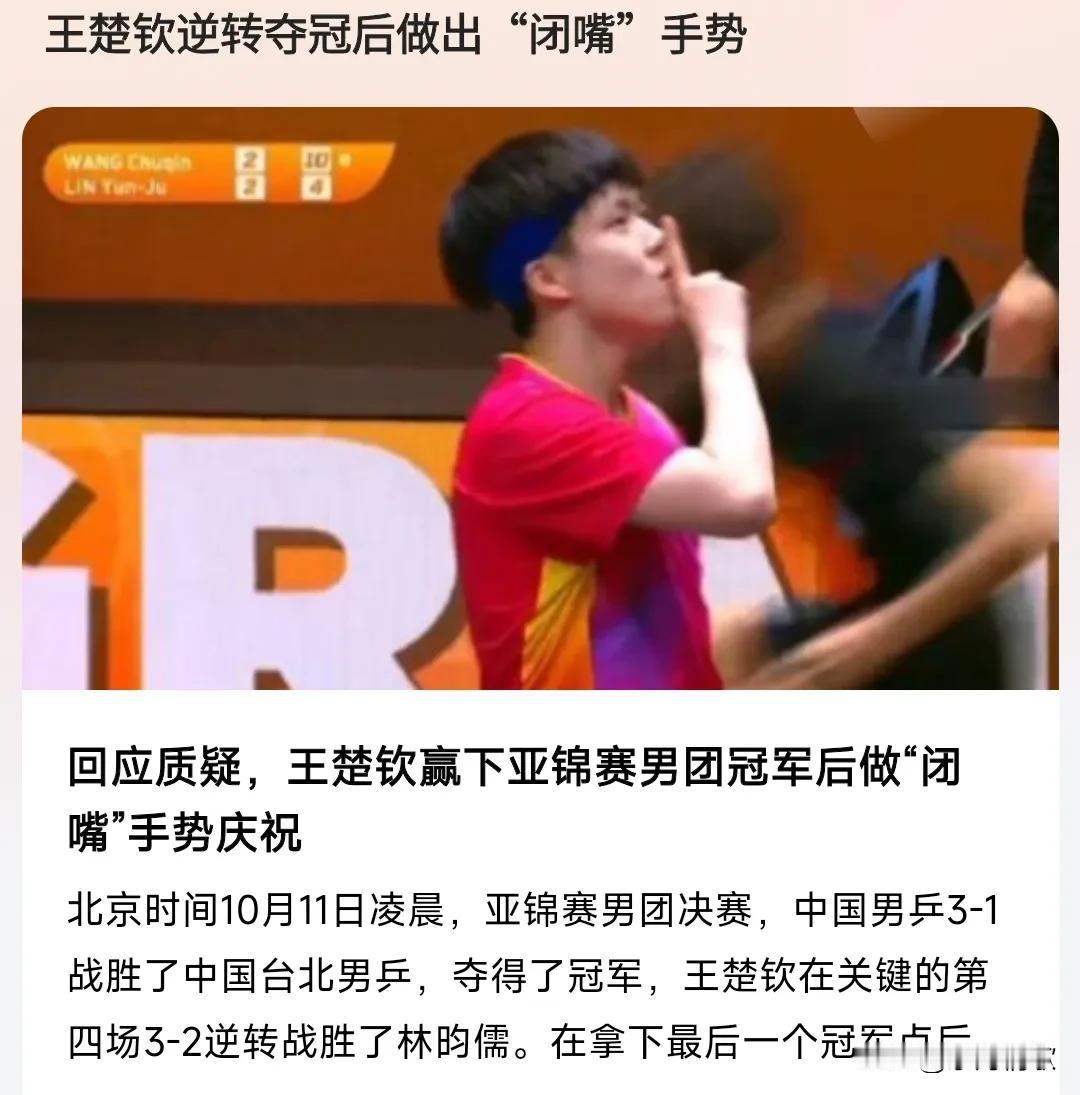 有些账号真的很过分,不会起标题就别起,搞得像是对王楚钦有意见一样。 王楚钦赢一下锦标赛,现场做了一个要人小声的动作,可能是让观众不要呼喊他的名字,低调一点,这是在乎对方选手自尊心的一种行为。 王楚钦做这个嘘的动作是要大家小声一点,低调一点。 而有的账号竟然起一个这样的标题“回应质疑,王楚钦赢下亚锦赛男团冠军后做“闭嘴”手势庆祝”。 在有的账号里,这手势竟然成了闭嘴,大家都知道闭嘴可不是什么好词。 这真的是太没底线了,看来这个账号并不怎么专业。 亏它还是个有影响力的账号。#王楚钦要大家低调#