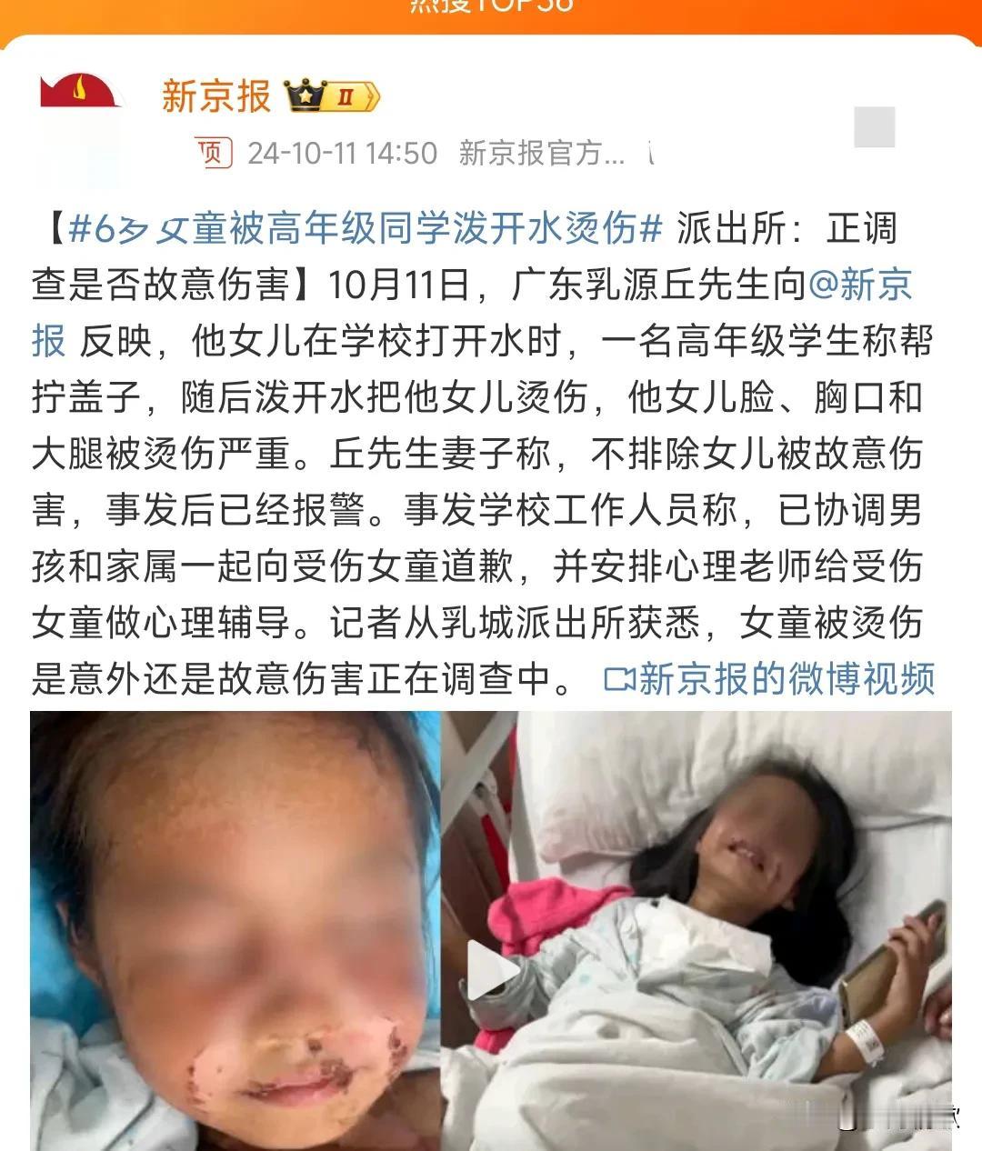 小女孩太惨了,10月11日,广东乳源,一男子反应他6岁的女儿在学校里打开水,一个六年级的同学说要帮她拧盖子,结果把热水从她头上流下来造成女孩被严重烫伤,有可能要留疤。 现在警方不确定男孩到底是故意的还是不是故意的,正在调查中。 男孩的家长过来道歉之后就没再过来了,因为警察怕起冲突,怕受害者父母找对方麻烦,现交给学校处理。 不管怎么说,这医药费肯定是要出的,如果被烫出疤了,那肯定要负责的,这么好的皮肤被烫坏了,赔偿是肯定也要的。 想不到6岁的女孩就开始要接触开水了。#6岁女童被高年级同学泼开水烫伤#