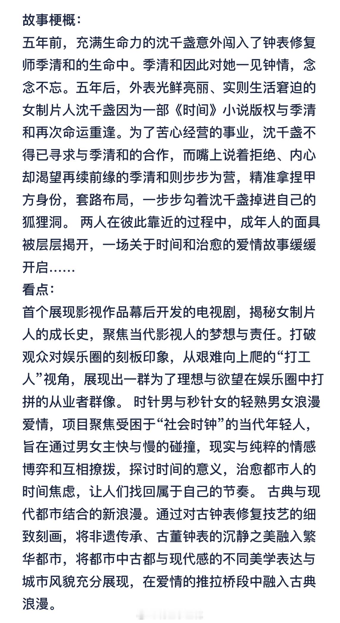 五年前,充满生命力的沈千盏意外闯入了钟表修复师季清和的生命中。季清和因此对她一见钟情,念念不忘。五年后,外表光鲜亮丽、实则生活窘迫的女制片人沈千盏因为一部《时间》小说版权与季清和再次命运重逢。为了苦心经营的事业,沈千盏不得已寻求与季清和的合作,而嘴上说着拒绝、内心却渴望再续前缘的季清和则步步为营,精准拿捏甲方身份,套路布局,一步步勾着沈千盏掉进自己的狐狸洞。两人在彼此靠近的过程中,成年人的面具被层层揭开,一场关于时间和治愈的爱情故事缓缓开启......