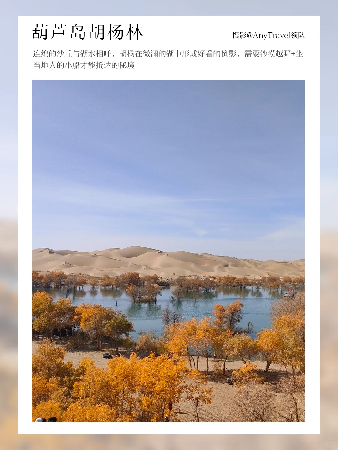 连绵的沙丘与湖水相呼,胡杨在微澜的湖中形成好看的倒影,需要沙漠越野+坐当地人的小船才能抵达的秘境