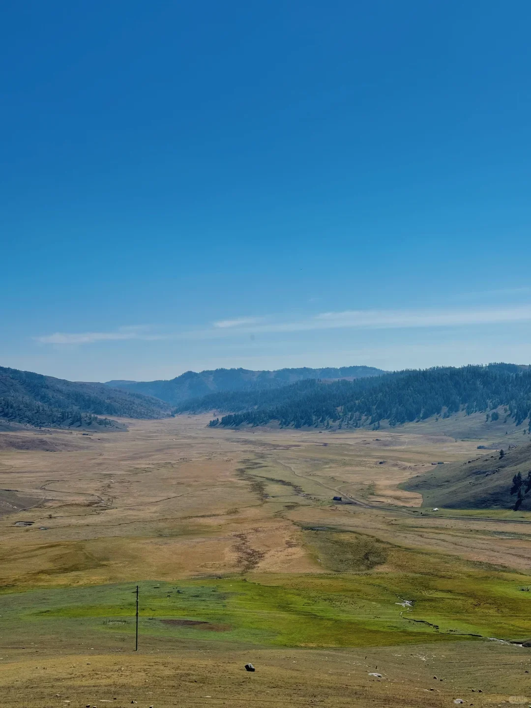 一路上有牧民的牧场、蜿蜒的道路、漫山的丛林🌲、草原、非常多悠闲吃草的牛羊、小溪、高山、蒙古包,非常原生态