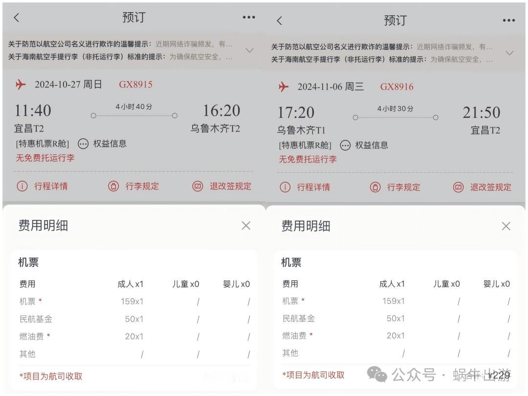 【458含税直飞往返新疆!多日期可出行】 北部湾航空,宜昌直飞往返乌鲁木齐! 这个票需要在海航的官方渠道才能够搜到。目前看到覆盖的日期是在10月底和11月,不过这个票是属于无免费托运行李额度,无消费积分累积,以及无定级航段和定级里程的机票。 分开搜可以看到,宜昌飞乌鲁木齐以及乌鲁木齐飞宜昌,都是有税前159元的单程价格。 算上税费的话,相当于宜昌飞乌鲁木齐,直飞往返含税价格是458元。 如果你是在武汉的话,好像也不算太麻烦,从汉口到宜昌东最便宜的动车票只需要53元。 #新疆##新疆旅游##特价机票#