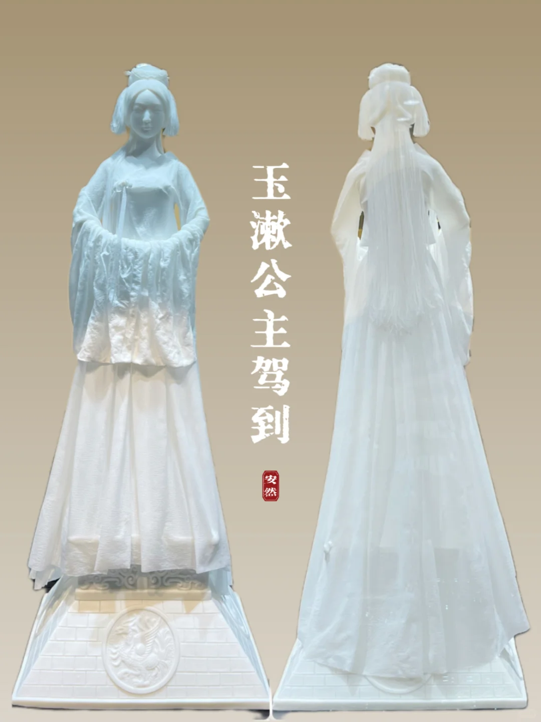 2、德化白瓷艺术品“玉漱公主”为当代福建陶瓷艺术大师连德理作品《神话》,灵感源自影视作品《神话》中的玉漱公主形象。纱衣轻盈飘逸薄至0.2毫米,发丝发丝纤毫毕现,玉漱公主脸部线条温润柔美,身形曼妙婀娜,尽显当代德化白瓷的细腻唯美,让人叹为观止。