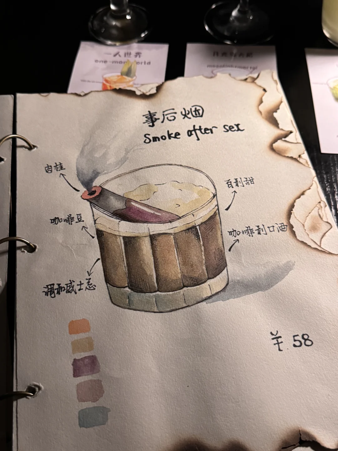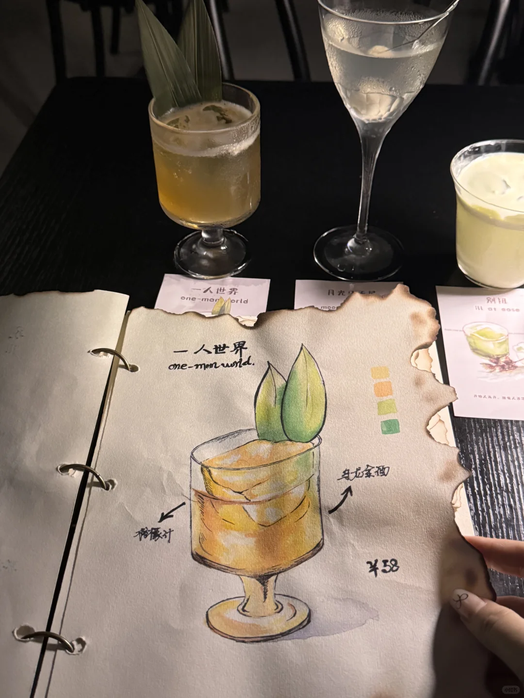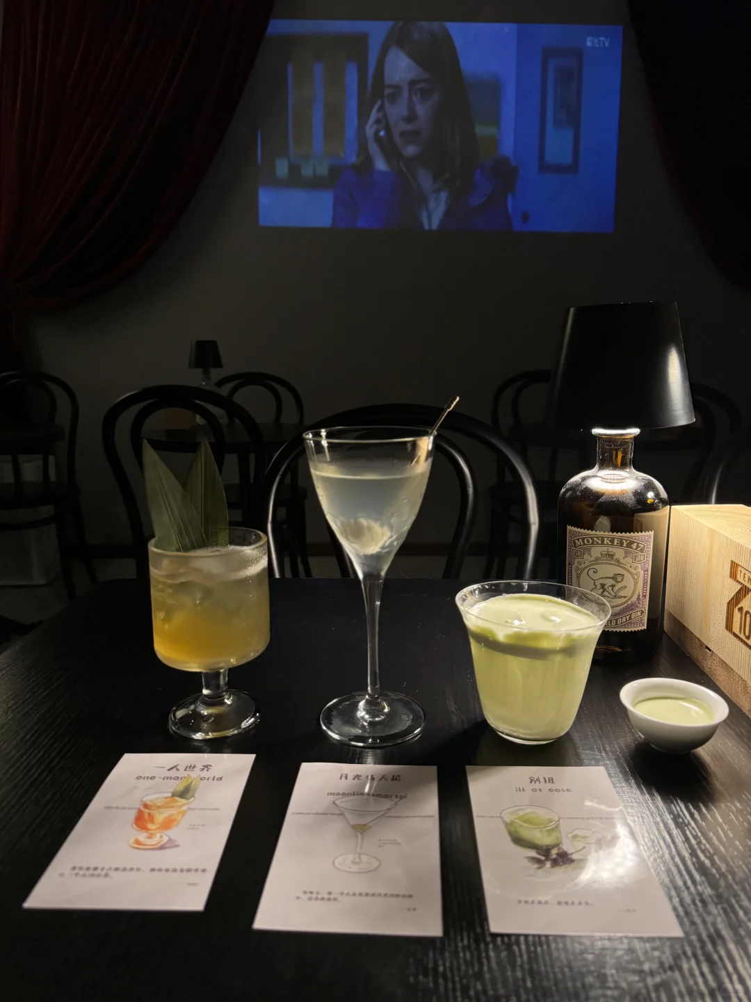 近期发现的一家超级chill的酒吧,藏在鸡鹅巷里,店里超有氛围感,投影放着我爱的《爱乐之城》,酒单是手绘的,月光马天尼、一人世界、事后烟,每款都很有意思。