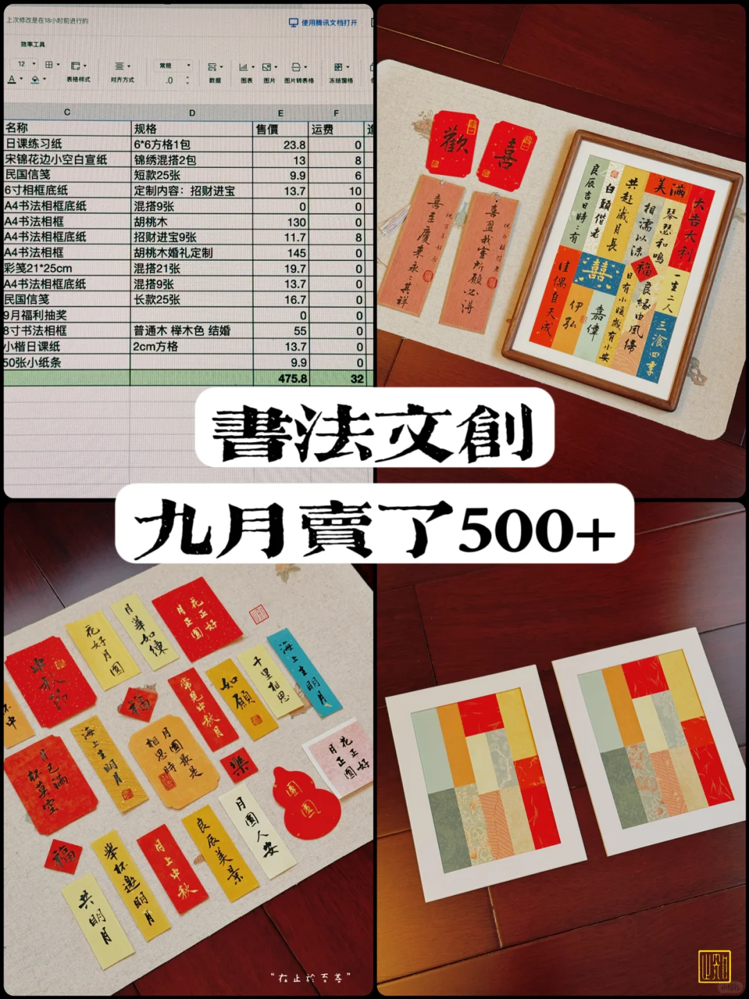 自发部店铺“财报”开始,就不断有想要从事概领域的书友问,开店怎么样?书法文创好卖吗?等等诸如此类的问题。在书法文创这个小行当,我的数据非常一般,但从销量、盈利上来看,也能窥见一些我的问题,以及书法文创面临的现状。五、六、七、八一共4个月,没有发营收笔记,也是因为过于惨淡,发出来怕贻笑大方。