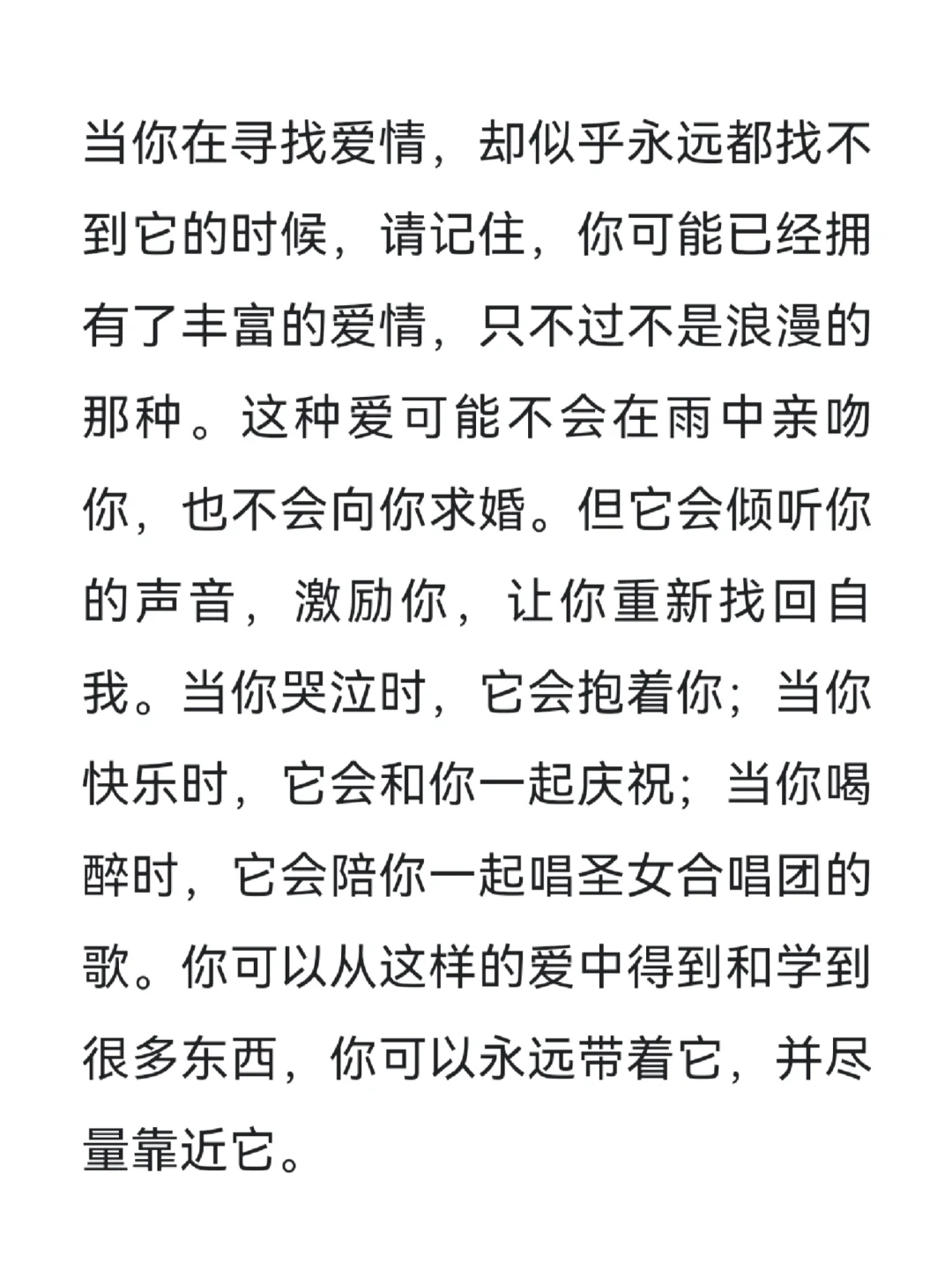 > “当你在寻找爱情,却似乎永远都找不到它的时候,请记住,你可能已经拥有了丰富的爱情,只不过不是浪漫的那种。”
