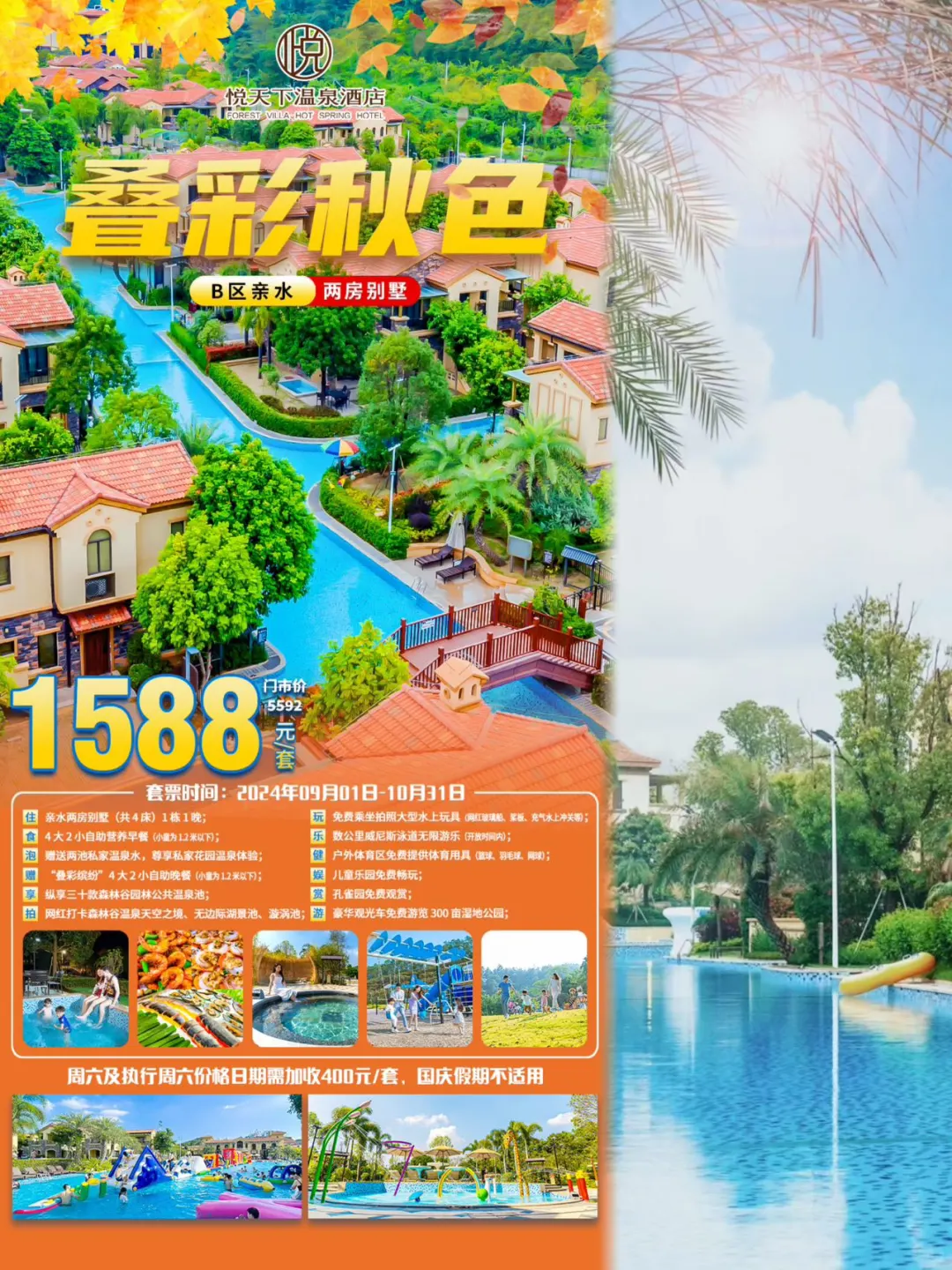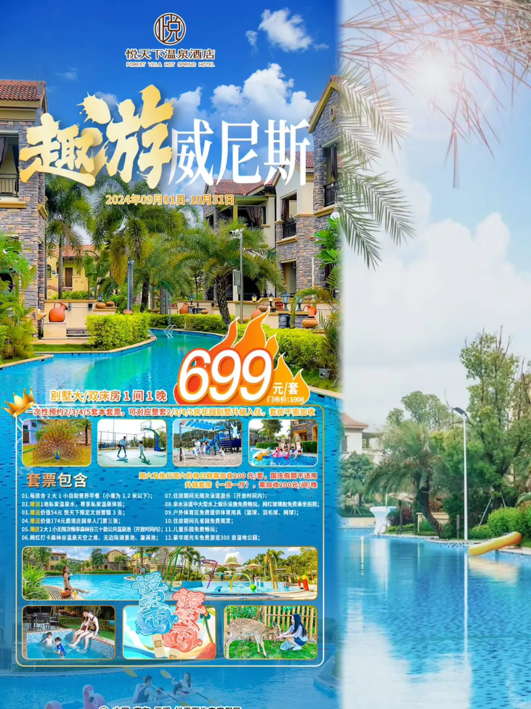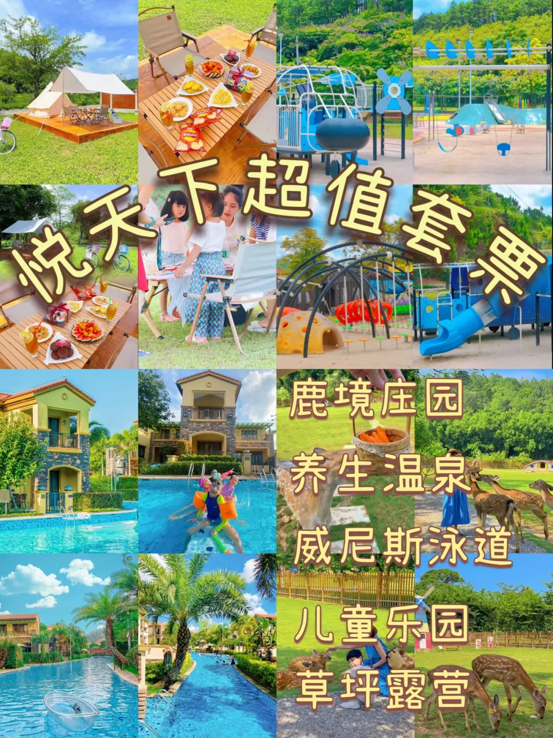 📣秋季优惠套票震撼来袭 现在想去悦天下的宝子真的有福了! ✅畅游威尼斯同款泳道 ✅畅泡天然养生温泉 人均竟然只要200+‼️千万不要错过 - 👇🏻大家庭、朋友出游等看这里👇🏻 【住】亲水两房别墅1栋1晚(4大2小) 【享】畅泡养生露天温泉 【享】畅游威尼斯泳道 【享】户外体育区+儿童乐园免费畅玩 【享】两池私家温泉水 【赠】孔雀园免费观赏+观光车游览300亩湿地公园 【食】自助营养早餐(4大2小) 【食】叠彩缤纷自助晚餐(4大2小) ⭕详情请查看图2 - 👇🏻亲子游、情侣游等看这里👇🏻 【住】别墅大/双床房1间1晚(2大1小) 【享】畅泡养生露天温泉 【享】畅游威尼斯泳道 【享】两池私家温泉水 【赠】鹿境庄园门票3张 【赠】孔雀园免费观赏+观光车游览300亩湿地公园 【食】自助营养早餐(2大1小) ⭕详情请查看图3 - 【悦天下温泉酒店】 ⛱威尼斯泳道: 不用出国、不用出省,在广东即可享受“水上威尼斯”同款超长泳道,出了阳台就能跳入泳池!不用担心晒,到处都有绿树可以乘凉,泳道上还有多种🛟网红同款泳具:🦩火烈鸟、香蕉船、小黄鸭、玻璃船等等免费提供使用!还有大型的水上滑梯,刺激又好玩,轻松get泳池📷美照,欢快💦戏水~ - ♨森林谷温泉: 大大小小共有30多种不同功效的温泉,隐藏在9000亩的森林溪谷中。四周被🌲绿树环绕,环境美如画,划分为5️⃣大特色主题,把所有的疲劳都放在这里吧~ - 🏡房间配套: 房内宽敞明亮,布置温馨舒适,带有🀄️麻将桌等设施,客房内还带有独立阳台和私家温泉♨️泡池,晚上在别墅花园的泡池泡温泉, 好惬意!无论是亲子游、家庭游、情侣游、闺蜜游、朋友聚会都是👍最好的选择~ - 酒店内的🦌鹿境庄园和🦚孔雀园也非常值得一去哦,各种户外体育用具,🏀篮球、🏸羽毛球等等也是免费提供使用~ 还等什么❓赶紧冲呀!