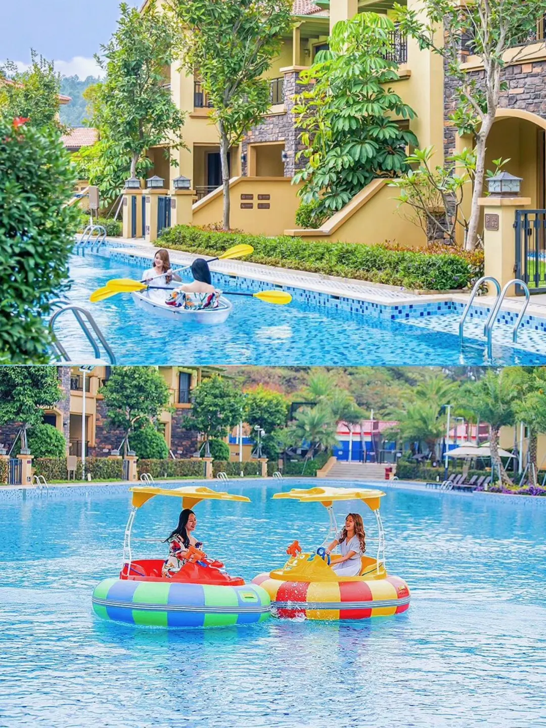 数公里长的泳道围绕着亲水别墅区,打开房间后花园就可以直接跳进泳道,尽情享受水花带来的乐趣💦桨板,玻璃船🚣,独角兽,竹筏各种ins网红漂浮玩具免费提供,有大型水上游乐设施,滑滑梯🛝,还会举办水上电音派对🥳,蹦迪打水仗!解压又快乐~不用出省就能玩转威尼斯,还能感受西班牙风情⛱️