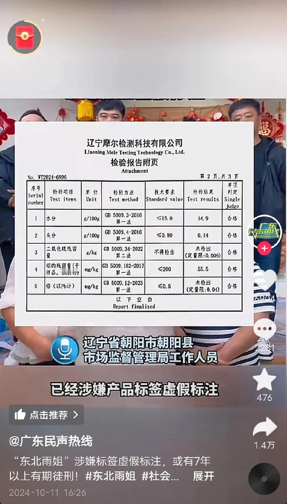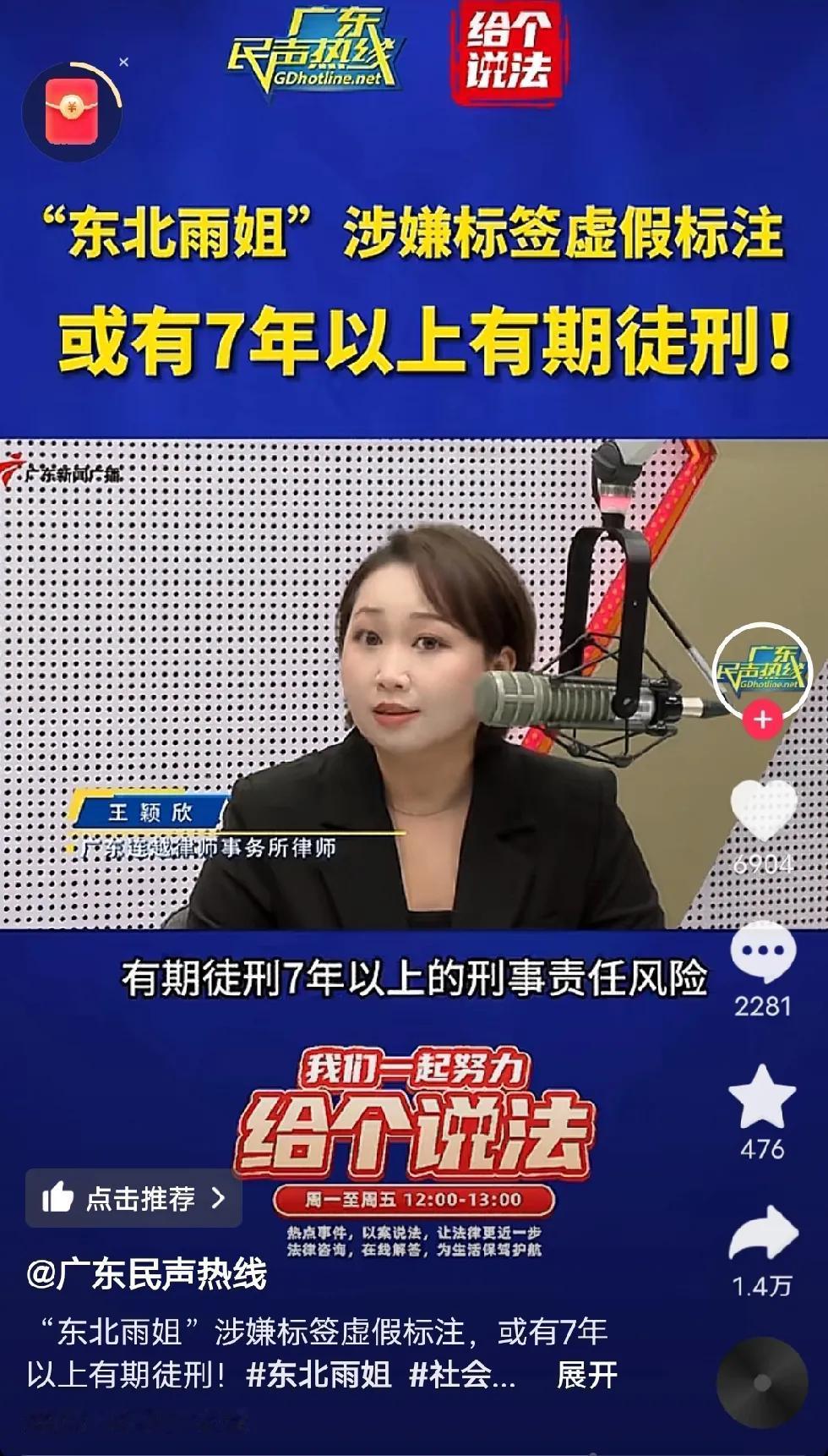 这回实锤了红薯粉条,没有红薯成分。 广东广播电视台官媒,访谈,律师解说,东北雨姐涉嫌标签虚假标注,有可能存在有期徒刑7年以上的刑事责任风险。