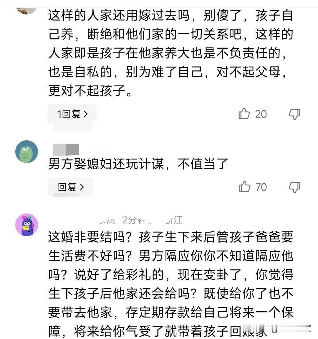 女孩子一定要聪明一点,爱惜自己的身体,保护好自己,不要听信男人的甜言蜜语,一定要结婚后再怀孩子,不要未婚先孕,不要过于的讨好对方。 男方做的实在是太不地道了,太没责任感,说好的给彩礼,结果不给了,说要孩子先生下来,迁了户口再给,真的是太能算计了。 对于这样的情况,还不如独自生下来,跟男方家说拜拜,自己独自养两个孩子。 这样的婚姻真的没必要接,男方的父母实在是太没诚信了,说好的给又不给了。 别傻傻的结了婚领了证户口再迁过去,这只是一个不靠谱的承诺而已。 除非有律师写公证。 现在的婚姻普遍没有安全感,还没结婚,就想着防着对方了。