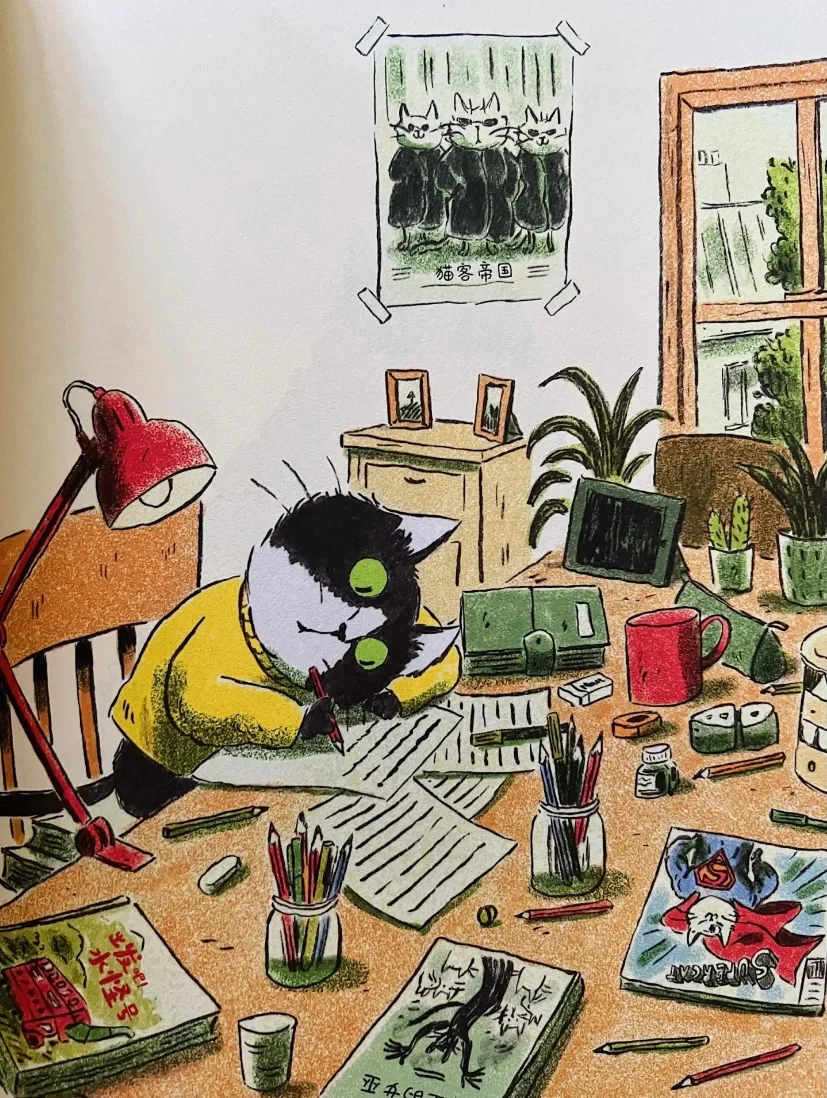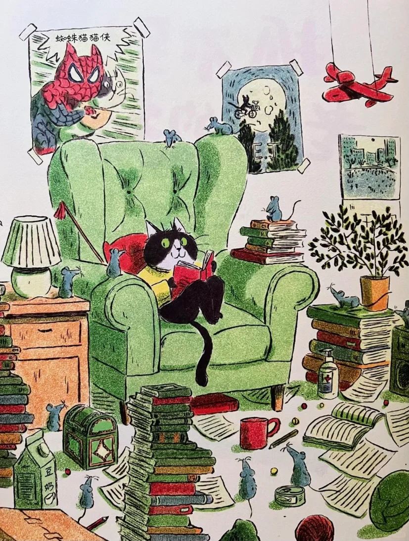 当我看到图4图5这两张插画的时候,我感觉我的生活就像这只小猫咪一样,在自己的小世界里认真做点事。我最近的日常大概就是看书、做饭、做标本装裱标本、听音乐啥的。