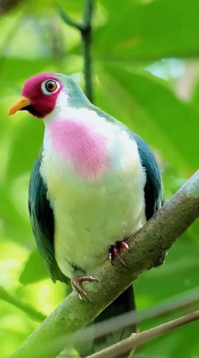 🍀粉头果鸠是一种色彩鲜艳的鸽形目、鸠鸽科小型鸟类,长度23-27厘米,重量大约40克。它的颜色特别鲜艳,眼睛周围有特殊的白环,鸟喙为橘色,腿为红色。成年雄性面部为深红色,喉部则为灰色,身体背部呈绿色,腹部呈白色,胸部有一粉红色的斑点,尾部下方则为棕色。成年雌性面部则为暗紫色,下方有较多部分呈绿色且尾部下方为肉桂色。亚成年粉头果鸠长相均类似雌鸟,但面部是绿色的,雄鸟在长出飞羽后39周长成全身羽毛。其绿色的羽毛在雨林中具有保护作用。