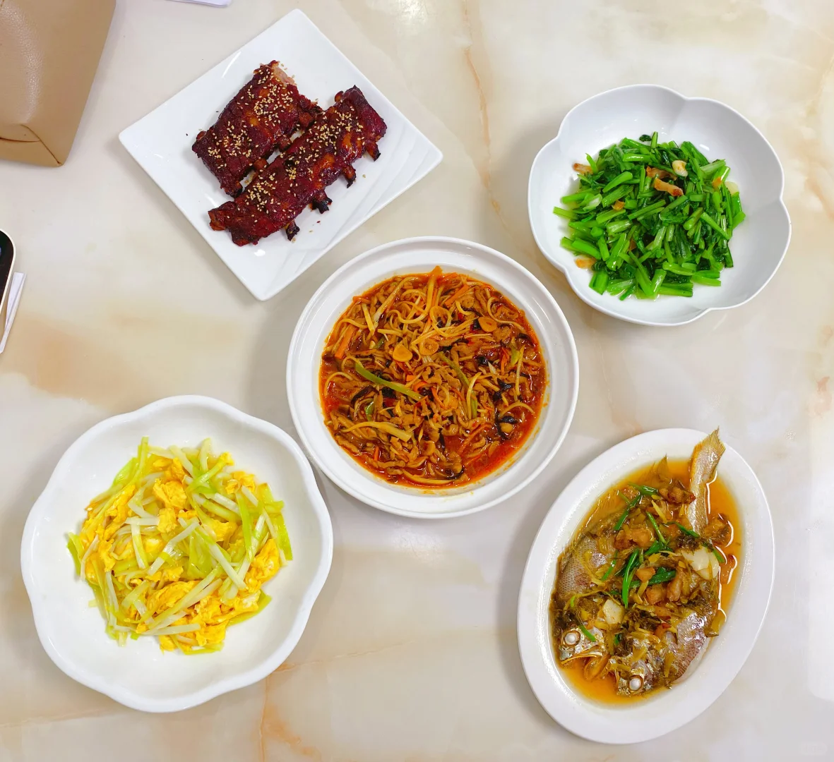 2024-10-14 🧑🍳今日份菜单🧑🍳 🍃烤肋排 🍃韭黄炒蛋 🍃鱼香肉丝 🍃雪菜梅鱼 🍃清炒菜心