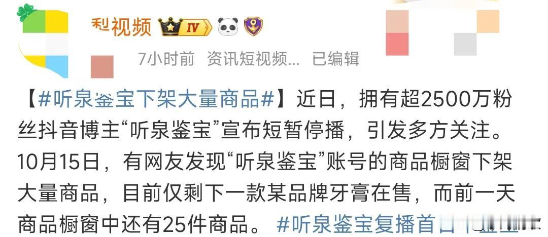 各位听泉鉴宝的粉丝们,不用太担心,你们心心念念的电子榨菜听泉鉴宝回来复播啦,不过他没有在搞娱乐的鉴宝啦,因为本来就是个娱乐主播,再鉴宝下去,估计事业不保。 有报道称,听泉鉴宝下架了大量商品,以前有25个商品,现在只留下一款牙膏了。 这也是明智的选择,如果再不下架的话,这虚假宣传就够他受的了。 网红现在的压力真的越来越大,只要有个负面新闻被盯上的话,那真的是很难翻身了。 这就是能力有多大,责任就有多大,真不是一般人能胜任的。 #听泉鉴宝下架大量商品#