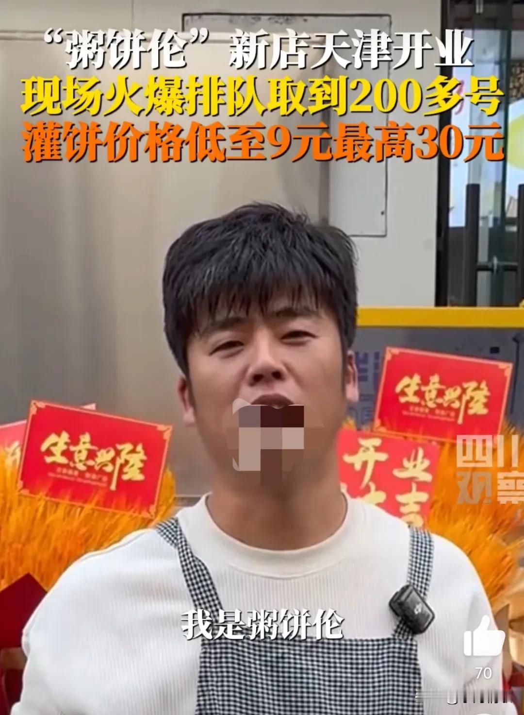 太给力了,粥饼伦不“打游击”了,已经有固定的门店,终于开店了,气氛是相当的棒,这真是自带流量。 新店有很多人去支持,大排长龙 ,店的位置在天津。 不知道以后会不会采取加盟的方式,不过大家肯定更愿意吃他自己做的饼。 就开这一家店,都不愁吃喝了,毕竟人气在这。 饼的价位从9块到30块不等,9块钱吃1次也是吃得起的。 30块的是全家福灌饼,9块的是石头饼。 就这名字就挺让人好奇的。 貌似请了个员工,他老婆呢? #粥饼伦终于开店了#