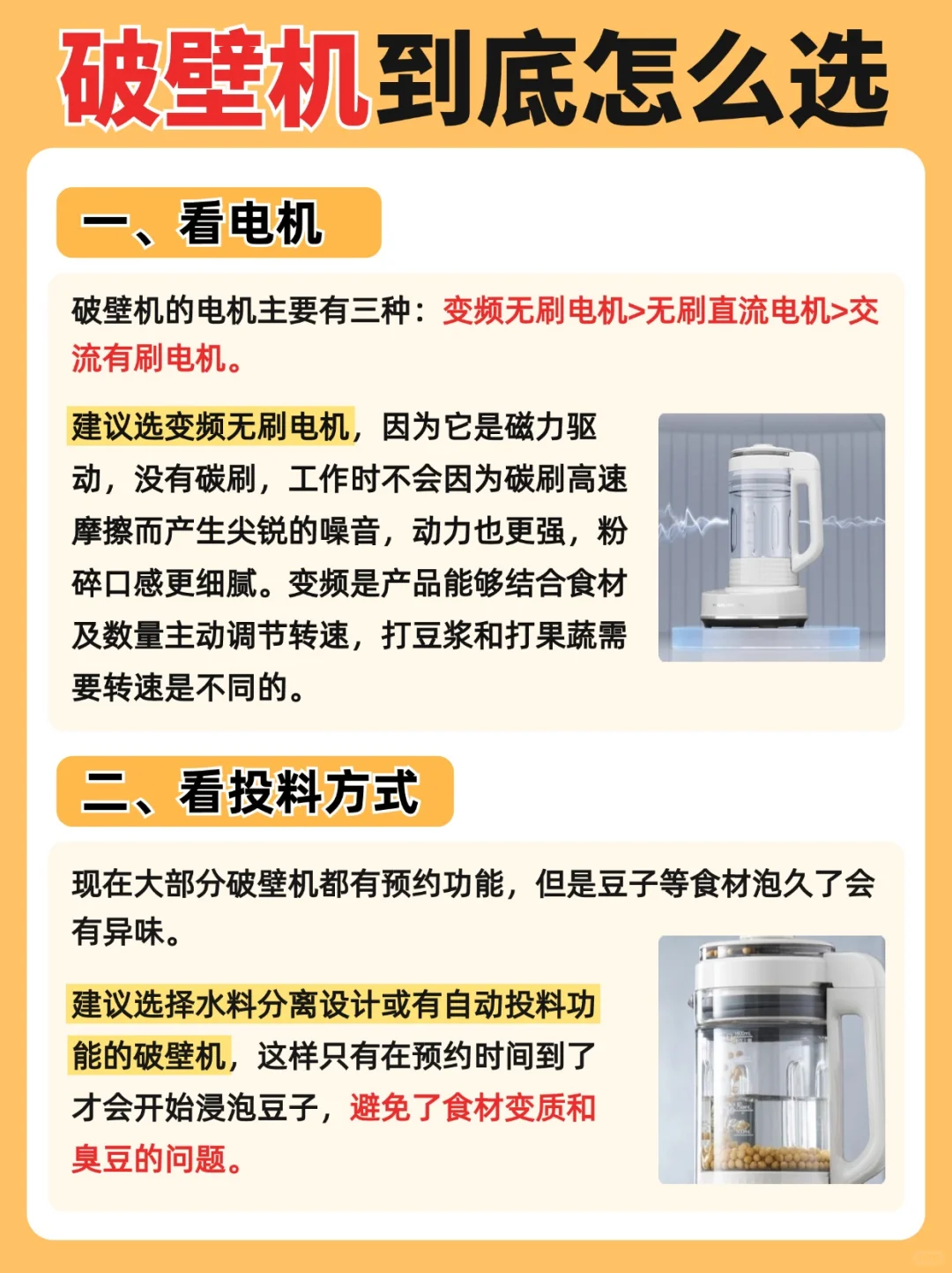 建议选变频无刷电机,磁力驱动,没有碳刷,动力更强,粉碎口感更细腻。