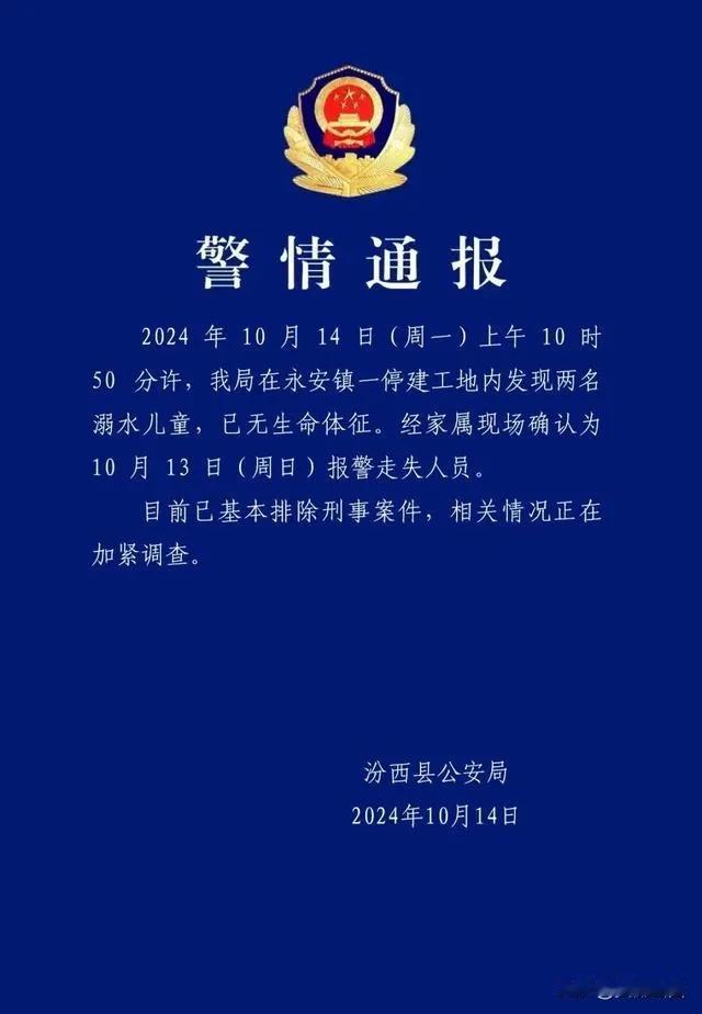 汾西连发布两份警情通报 2名溺水儿童遗体在工地发现