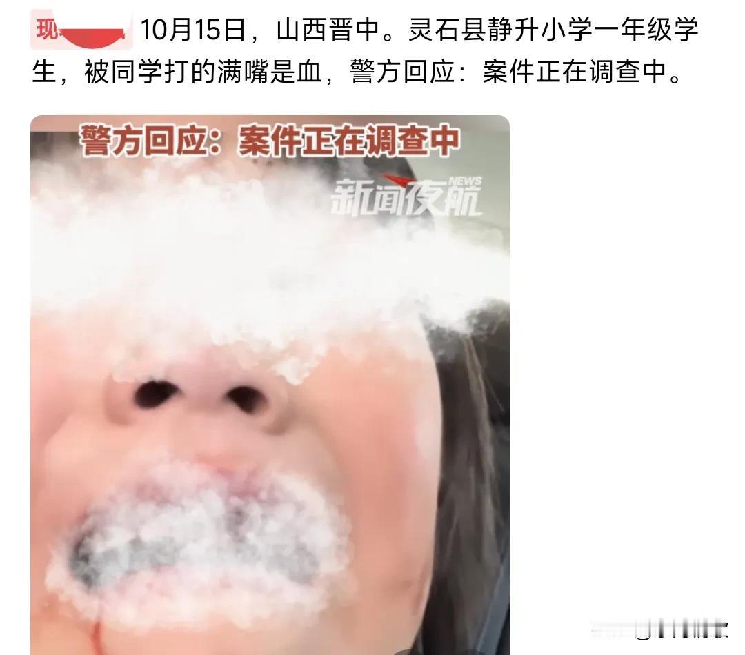 这也太令人发指了吧,小学就已经出现校园暴力了,10月15日山西晋中,灵石县静升小学一年级学生,竟然被同学打的满嘴是血,女孩说是被8个同学打的。 有人问她:8个也不找老师啊? 她说被堵住了,不让找老师。 孩子说想退学。 警方反映称案件正在调查中。 这真的是有够炸裂的,一年级的人就开始校园霸凌了。 现在的校园环境真是令人堪忧啊。#警方回应女孩被8个同学殴打#