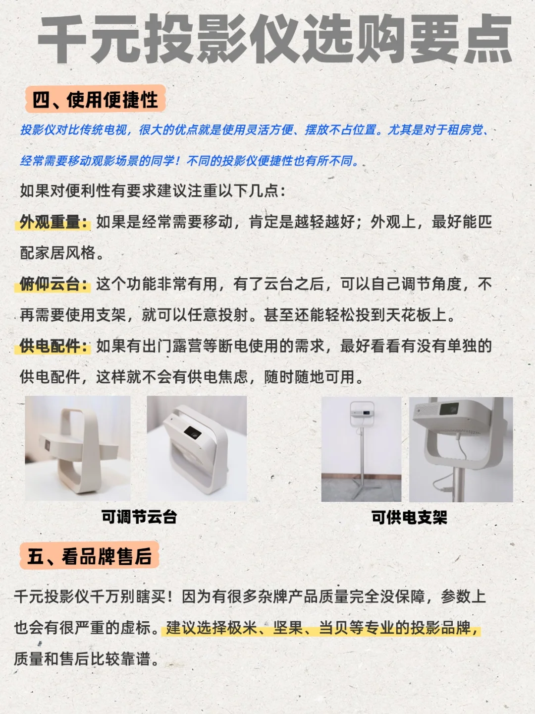 俯仰云台:有了云台之后,可以自己调节角度,不再需要使用支架,就可以任意投射。甚至能轻松投到天花板上。