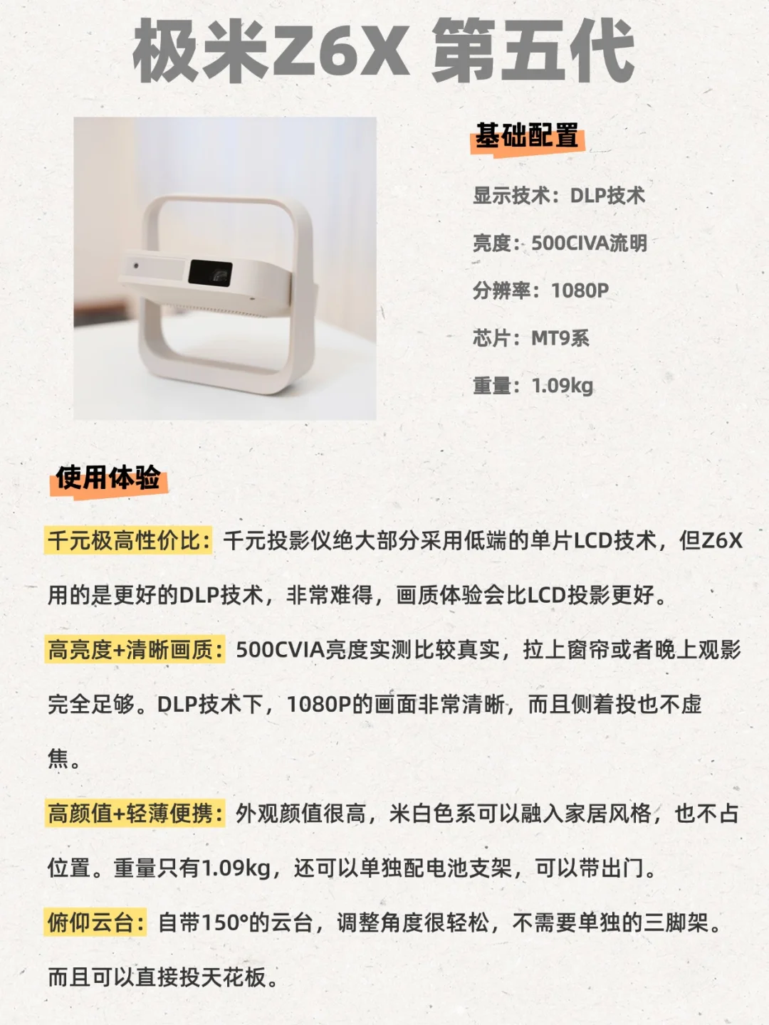 1.千元极高性价比:千元投影仪绝大部分采用低端的单片LCD技术,但Z6X用的是更好的DLP技术,非常难得,画质体验会比LCD投影好很多。