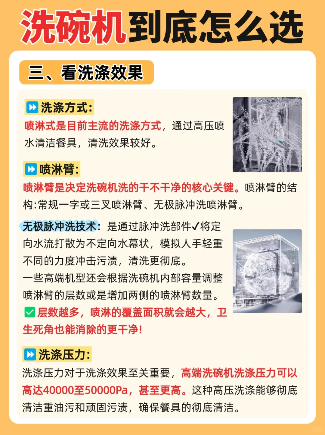喷淋臂是决定洗碗机洗的干不干净的核心关键,建议选有无极脉冲洗技术的+喷淋层数多的,可以模拟人手轻重不同的力度冲击污渍,覆盖面积大,卫生死角也能消除的更干净!