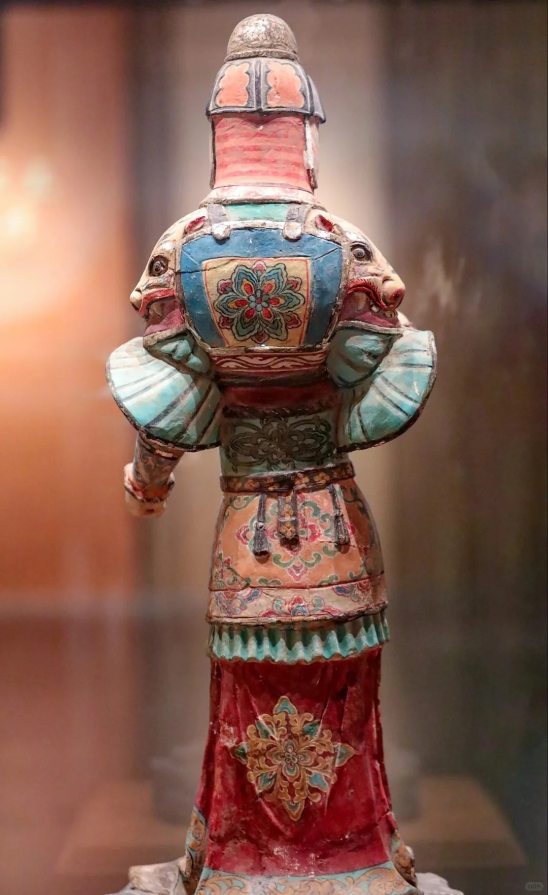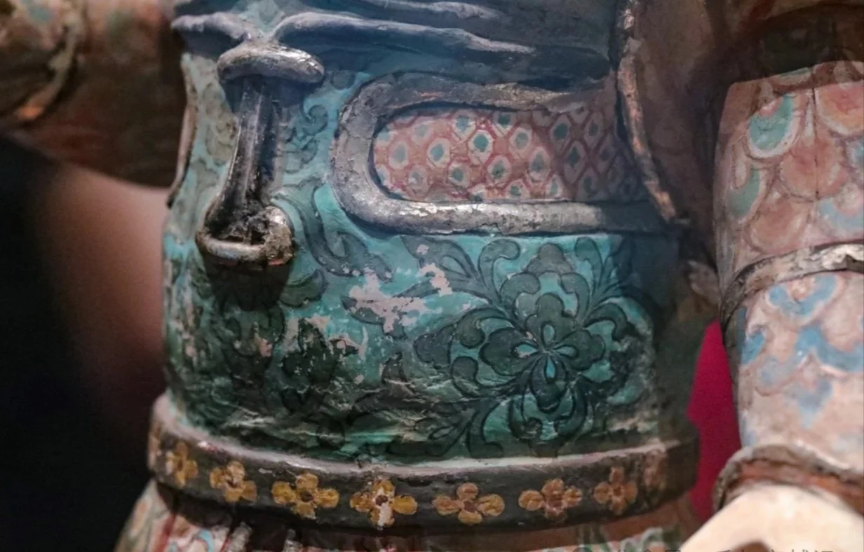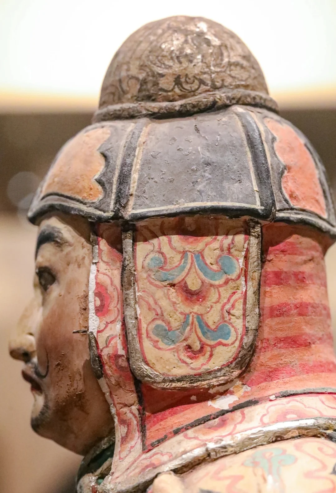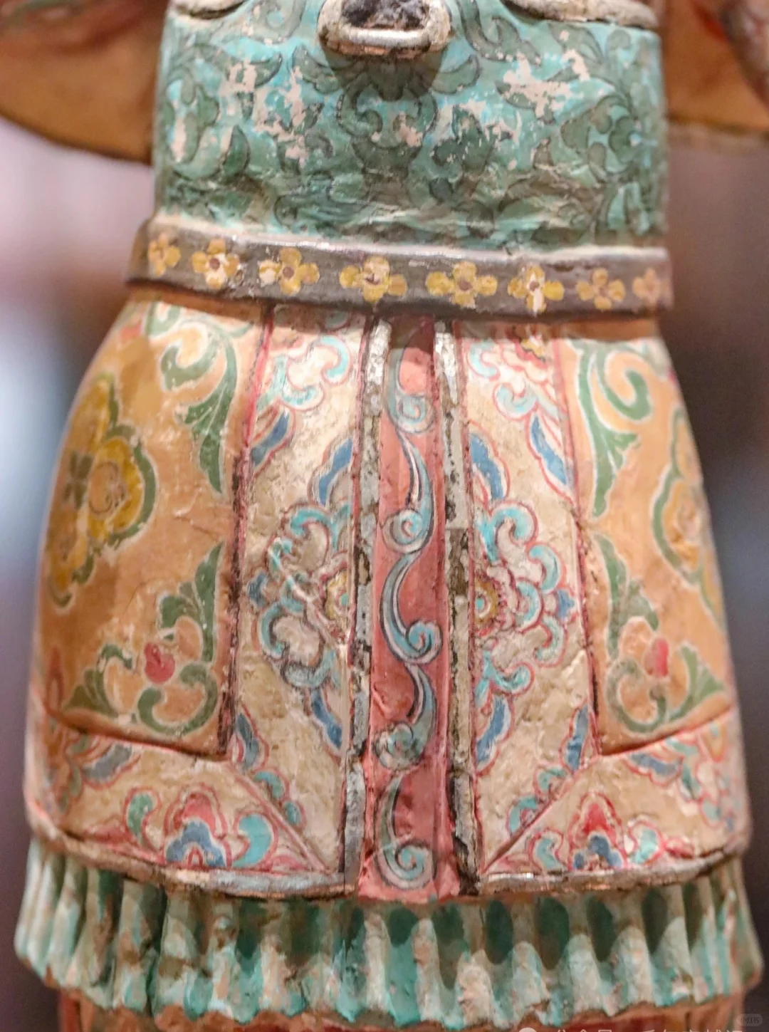 昭陵博物馆镇馆之宝“彩绘釉陶贴金文、武官俑” 但这个武官俑的铠甲与我们印象中的武将铠甲不太一样……,还有这和唐朝的虎背熊腰不一样,这身材也太纤细! 这是唐初张士贵墓彩绘釉陶贴金武官俑,通高72.5厘米,头戴圆顶兜鍪,有护耳、披帻,内穿紧袖龙鳞纹战袍,外着明光铠,胸前圆护一对,双肩覆虎头护膊,腰带以下左右大腿上各垂一片膝裙,膝裙边缘饰波纹状流苏,下着红色裤,外穿红底饰花战袍,足蹬黑色圆头战靴。
