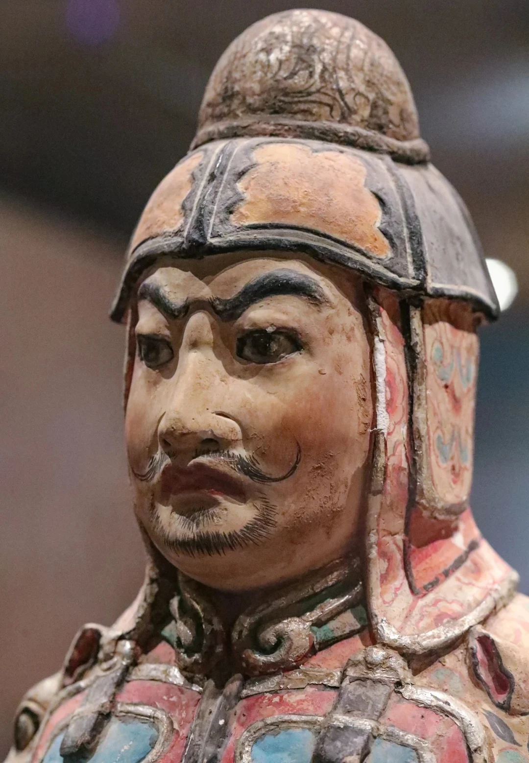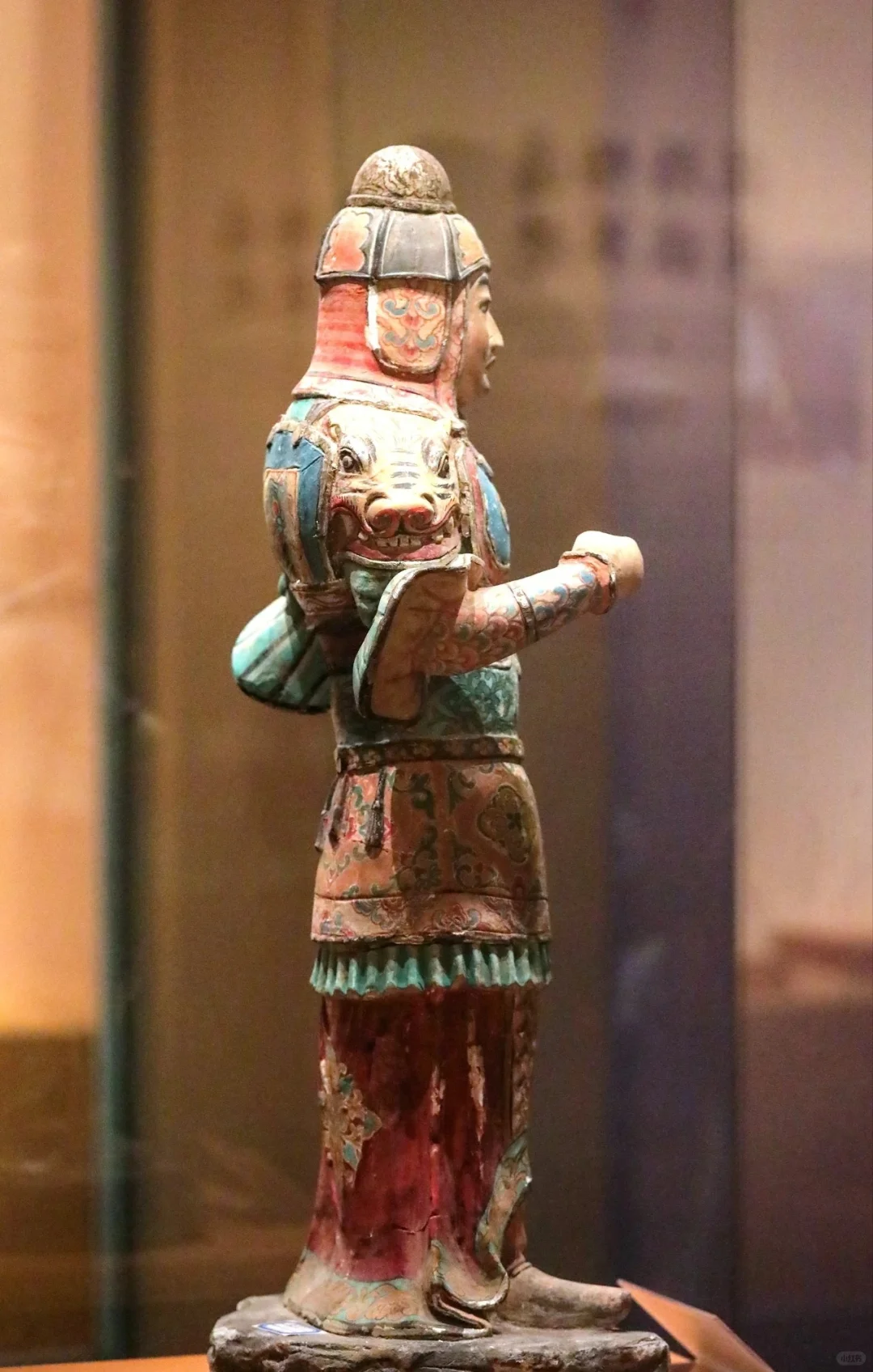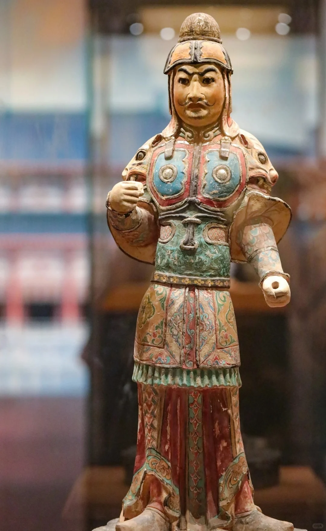昭陵博物馆镇馆之宝“彩绘釉陶贴金文、武官俑” 但这个武官俑的铠甲与我们印象中的武将铠甲不太一样……,还有这和唐朝的虎背熊腰不一样,这身材也太纤细! 这是唐初张士贵墓彩绘釉陶贴金武官俑,通高72.5厘米,头戴圆顶兜鍪,有护耳、披帻,内穿紧袖龙鳞纹战袍,外着明光铠,胸前圆护一对,双肩覆虎头护膊,腰带以下左右大腿上各垂一片膝裙,膝裙边缘饰波纹状流苏,下着红色裤,外穿红底饰花战袍,足蹬黑色圆头战靴。