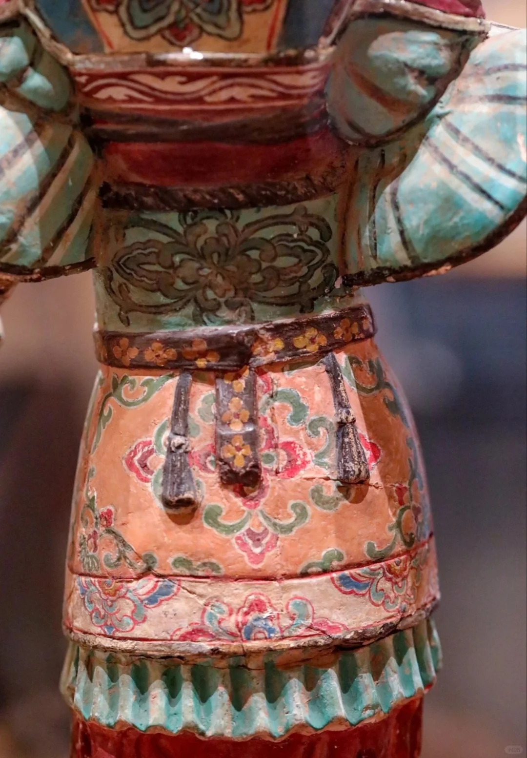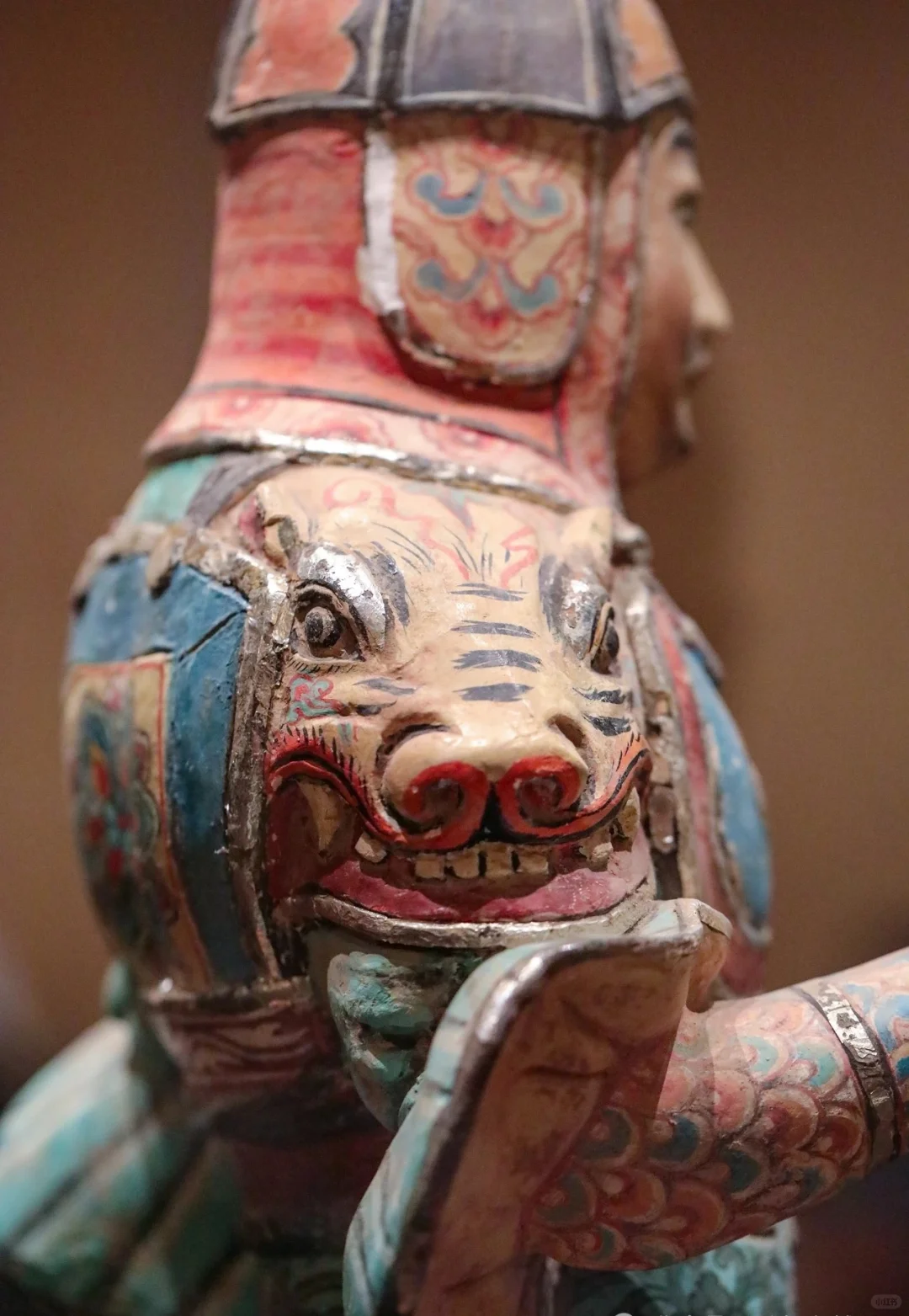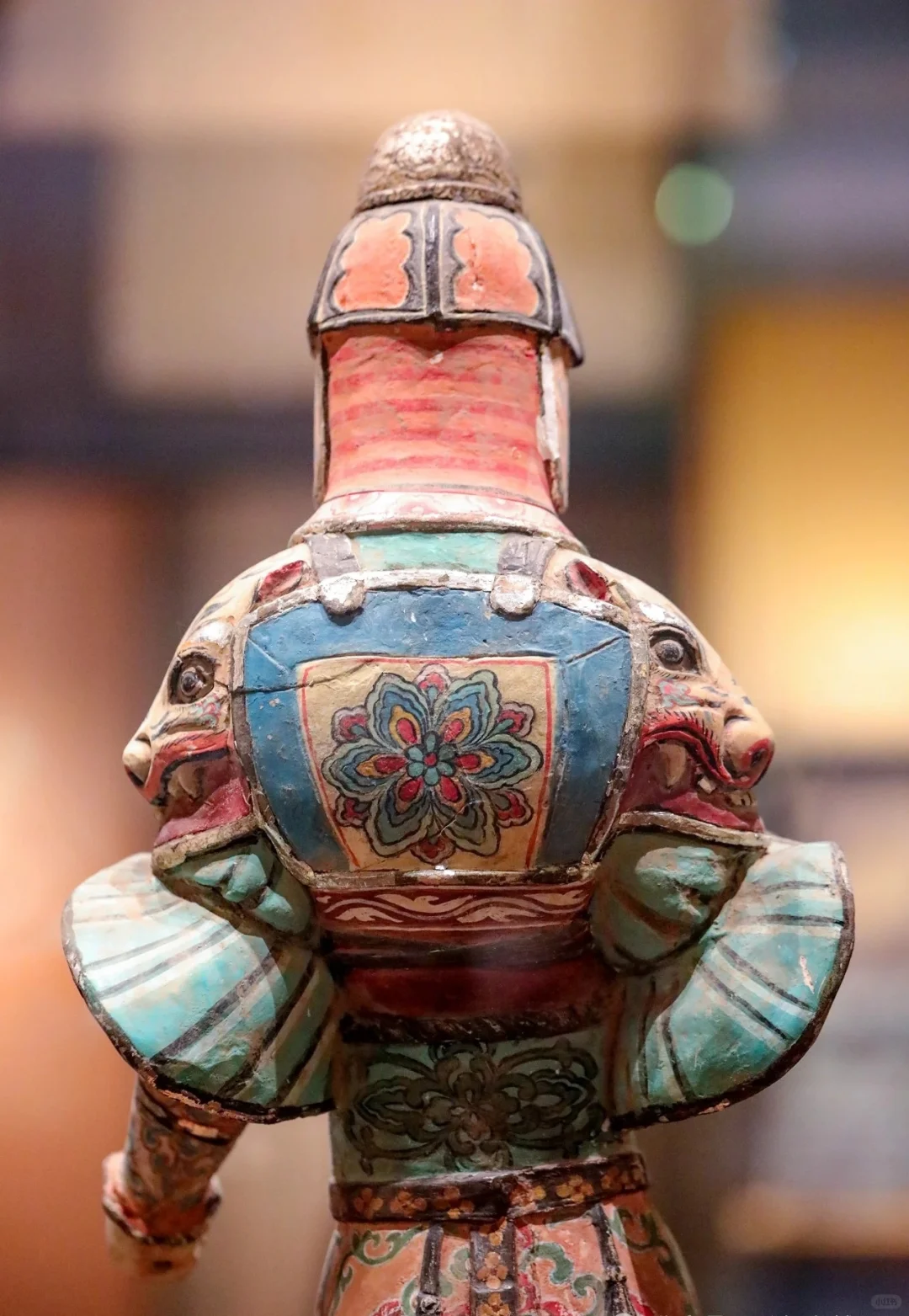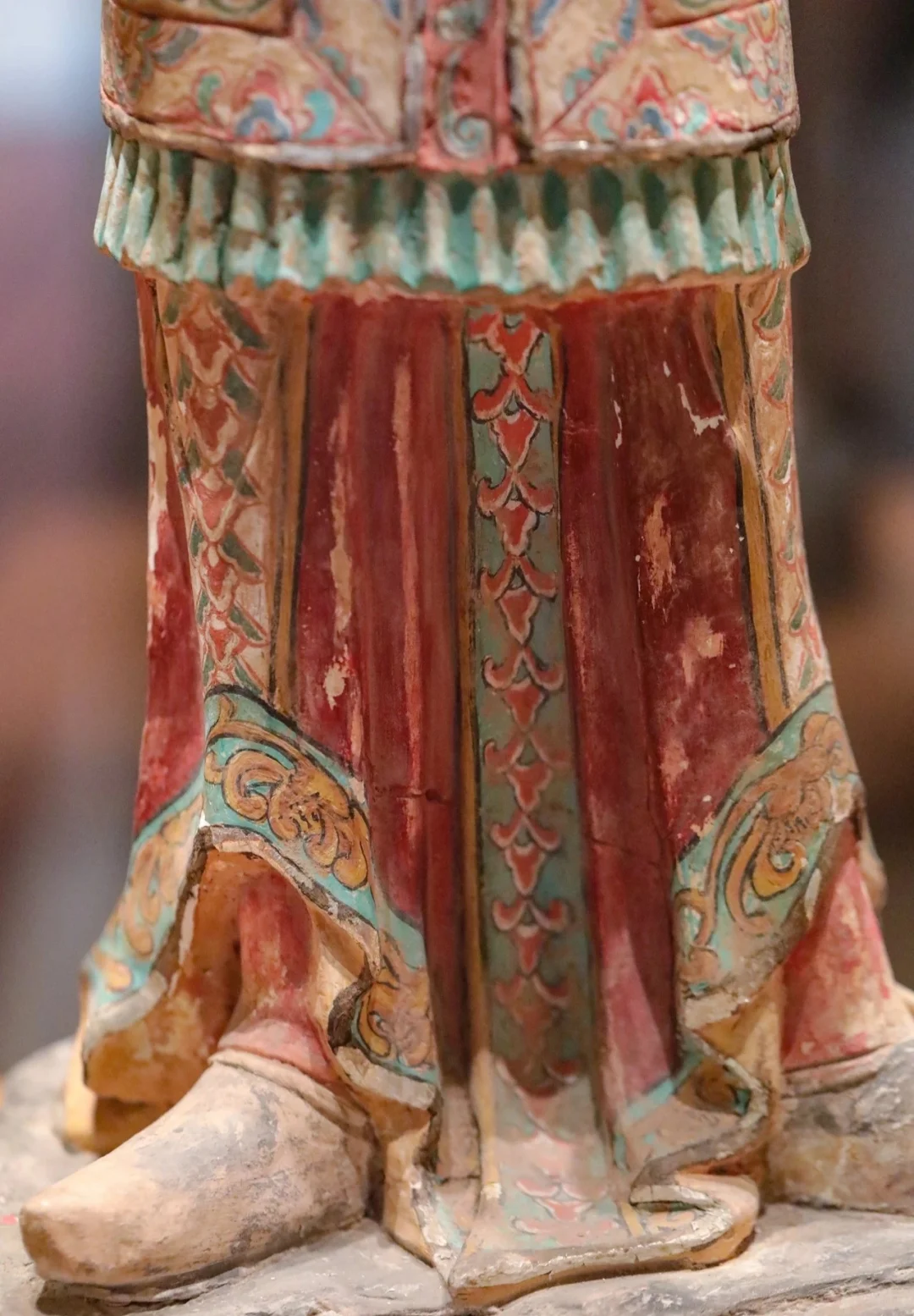 昭陵博物馆镇馆之宝“彩绘釉陶贴金文、武官俑” 但这个武官俑的铠甲与我们印象中的武将铠甲不太一样……,还有这和唐朝的虎背熊腰不一样,这身材也太纤细! 这是唐初张士贵墓彩绘釉陶贴金武官俑,通高72.5厘米,头戴圆顶兜鍪,有护耳、披帻,内穿紧袖龙鳞纹战袍,外着明光铠,胸前圆护一对,双肩覆虎头护膊,腰带以下左右大腿上各垂一片膝裙,膝裙边缘饰波纹状流苏,下着红色裤,外穿红底饰花战袍,足蹬黑色圆头战靴。