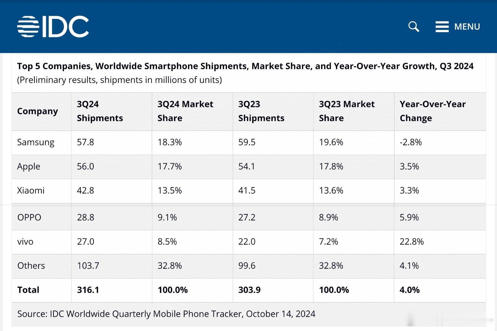 全球第三季度的三家份额报告,排名都一样的:三星、苹果、小米、OPPO、vivo。传音掉出top5。