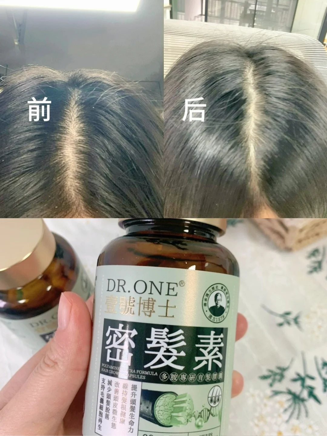 ✅后来在朋友建议下试了试香港DR.ONE的密发素,朋友说这个可以改善脱发,她用了几个月,头顶已经长了小绒毛。