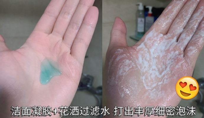 它的洗感有一种纱触感,水很密,细腻轻柔。打在身上不刺痛,直接冲脸也不会觉得硬疼,不伤皮肤。