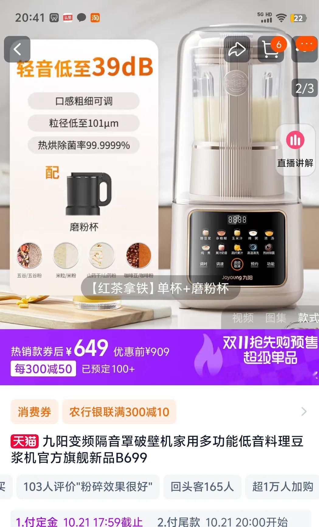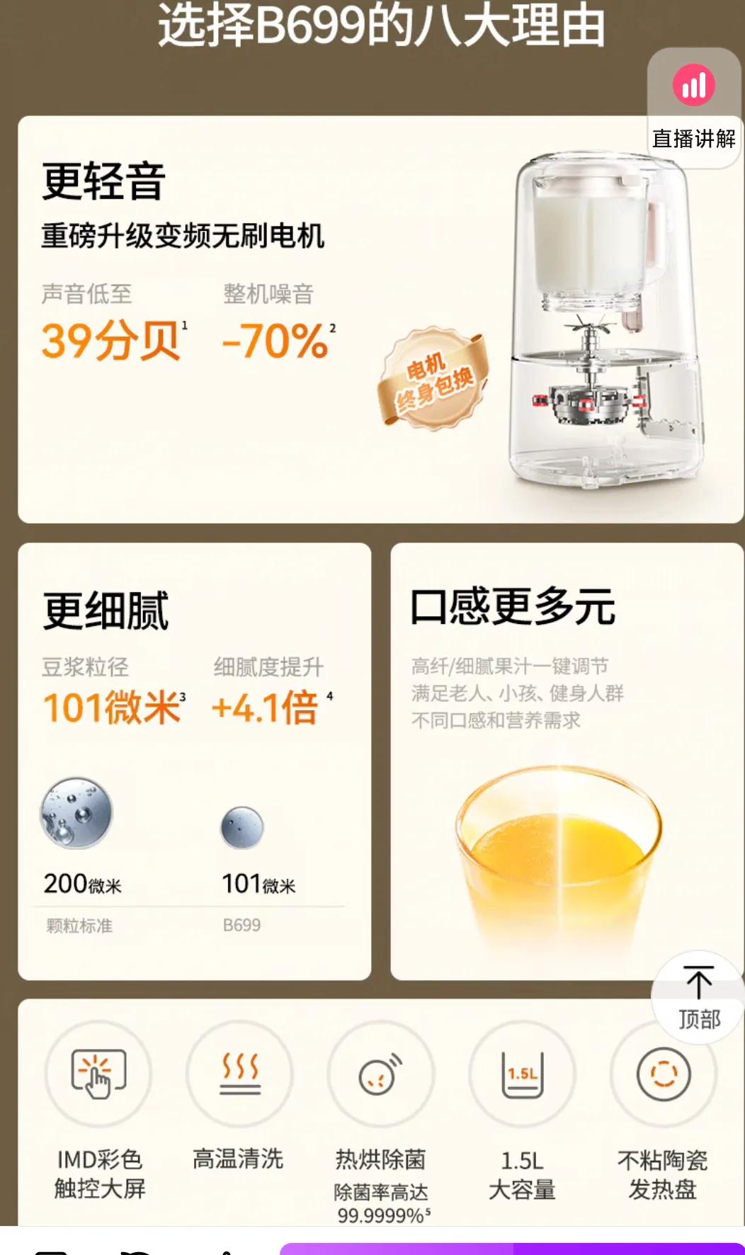 #理想家生活#10.14,我家的破壁机彻底坏了:我只放入1L的水,都溢出来不少,煮20多分钟,还没有研磨的过程,必须考虑重新入手一个[比心][比心][比心] 我中意的,是九阳变频隔音罩新品b699!!! 八大优点:更轻音,39db;更细腻;口感更多元;ⅰMD彩色触控大屏;高温清洗:热烘除菌、1.5L大容量;不粘陶瓷发热盘!! 双十一,选九阳品牌破壁机,毋庸置疑。至于价位,跟老公商量一下!!!