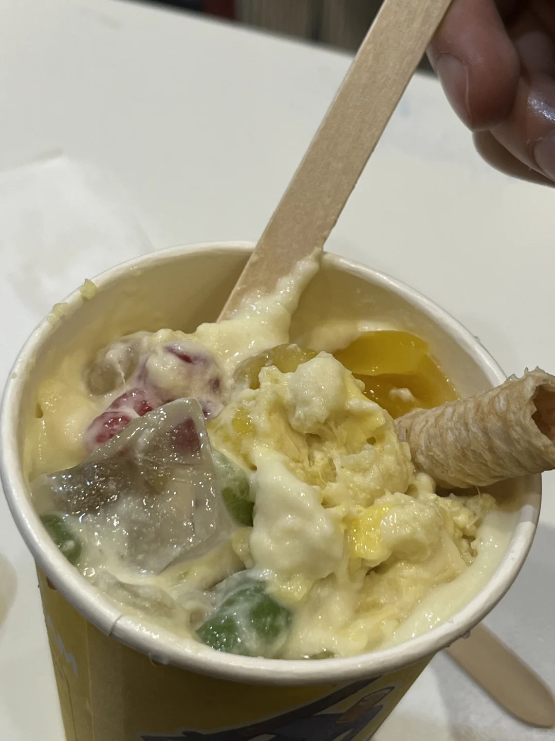 路过这家甜品店好多次了,终于忍不住好奇进去尝尝,不去不知道,一去吓一跳 点了两种,一个榴莲冰激凌和一个best seller 榴莲爱好者真的有福气啦,榴莲冰激凌超浓郁,还有榴莲果肉和一点菠萝蜜,真的爱死 best seller也很好吃,各种五颜六色的小料给这杯甜品带来了丰富的口感,再加上榴莲果肉,非常值得一试 关键是这两杯各$8.9,还这么大杯,不比吃雪球好吗